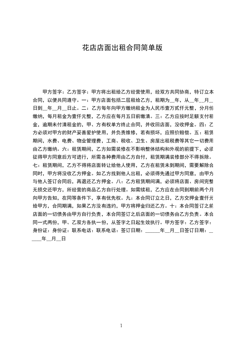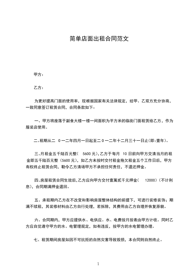 一、甲方将座落于副食大楼一楼一间面积为_____平方米的临街门面租赁给乙方,作为服装店使用。
