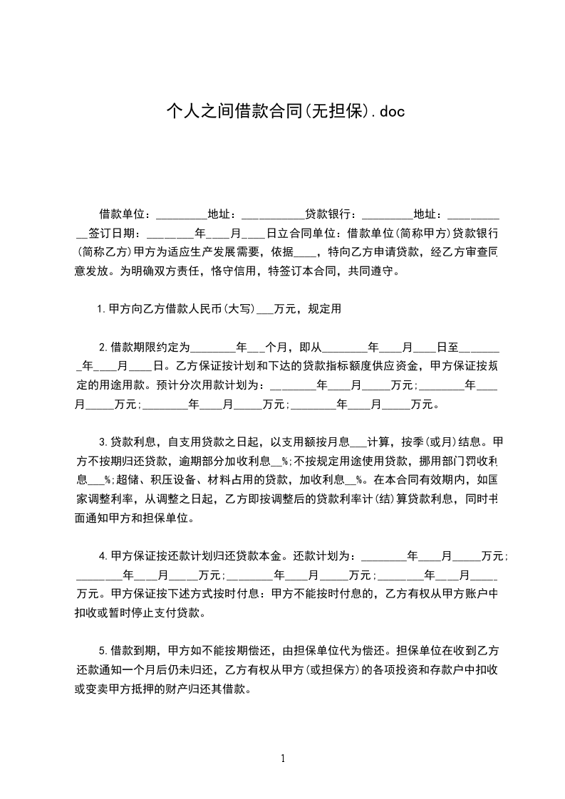 借款单位:_________地址:___________贷款银行:_________地址:___________签订日期:________年____月____日立合同单位:借款单位(简称甲方)贷款银行(简称乙方)甲方为适应生产发展需要,依据____,特向乙方申请贷款,经乙方审查同意发放。为明确双方责任,恪守信用,特签订本合同,共同遵守。