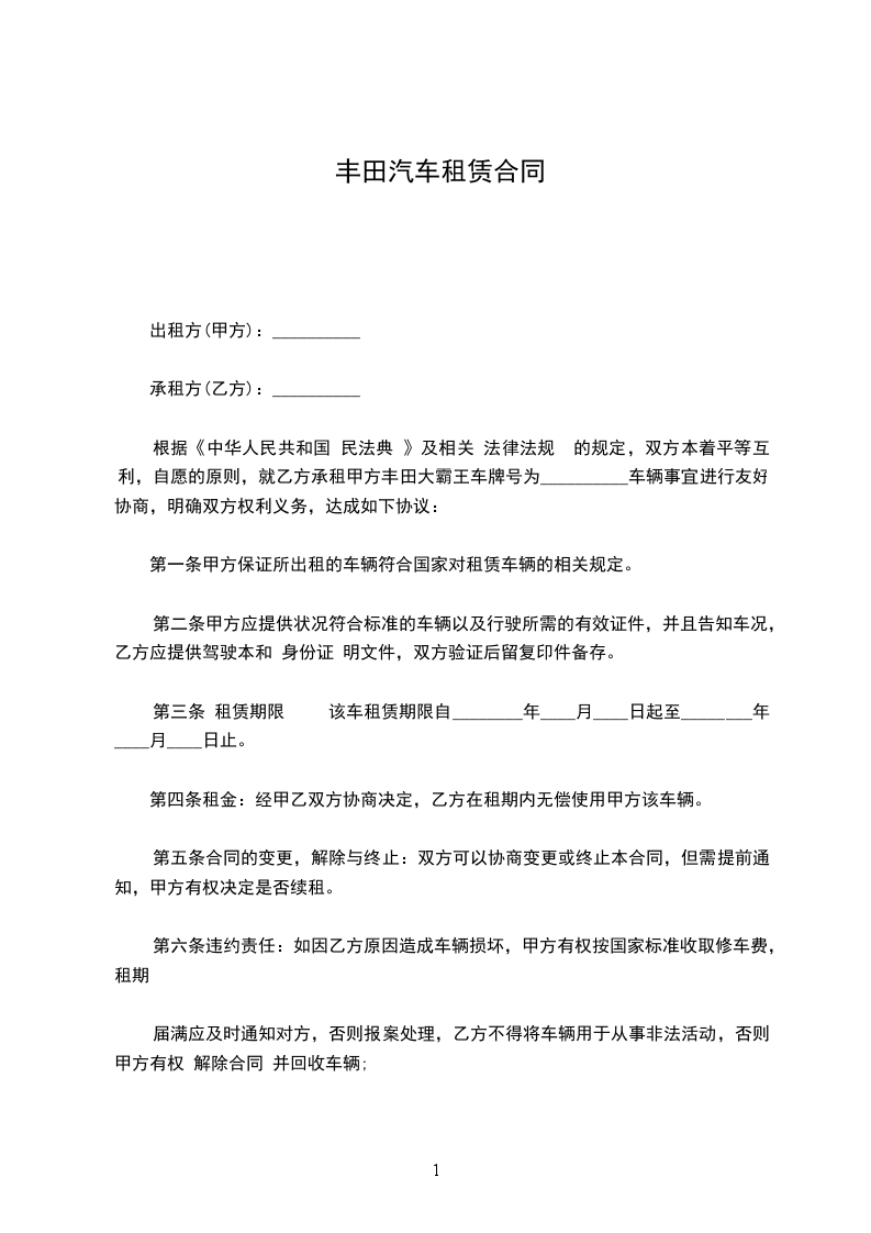 根据《中华人民共和国 民法典 》及相关 法律法规 的规定,双方本着平等互利,自愿的原则,就乙方承租甲方丰田大霸王车牌号为__________车辆事宜进行友好协商,明确双方权利义务,达成如下协议: