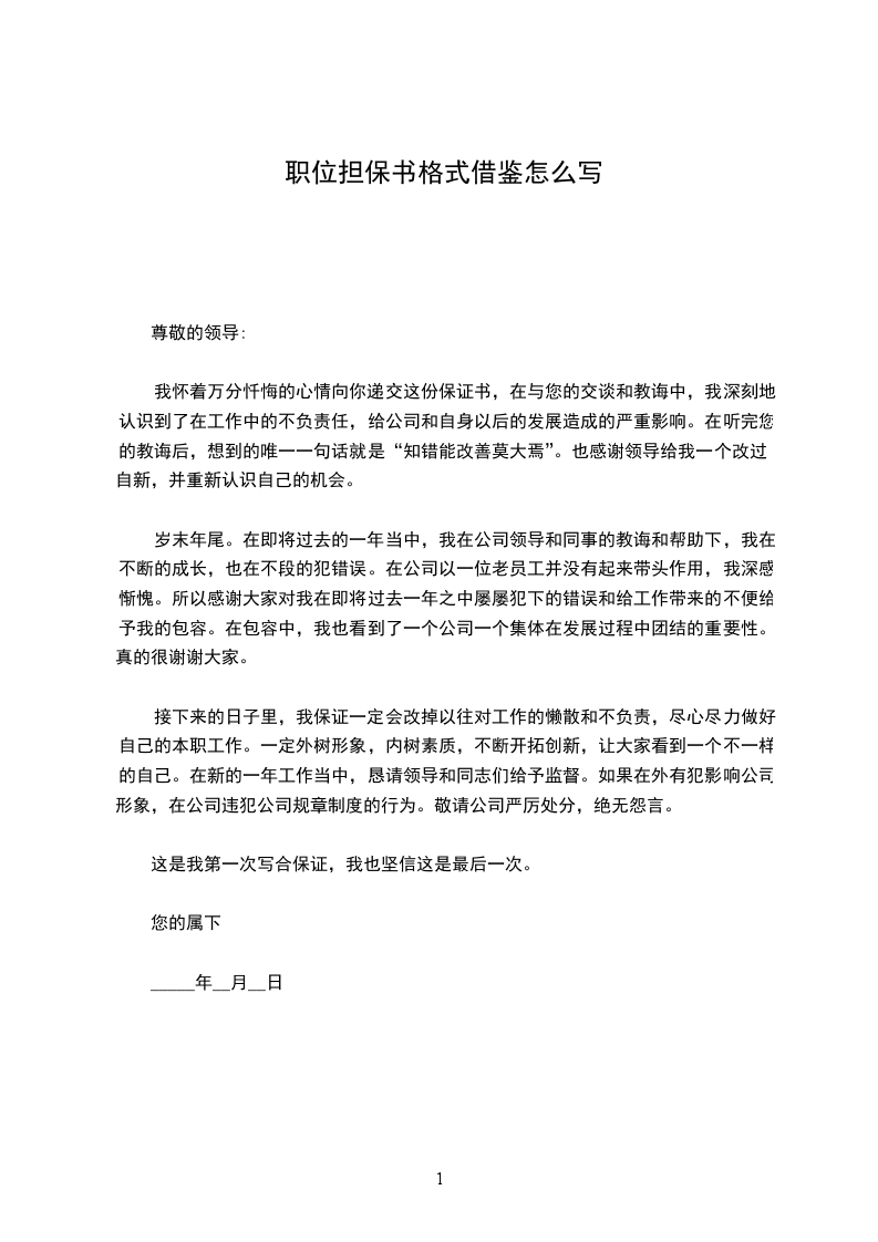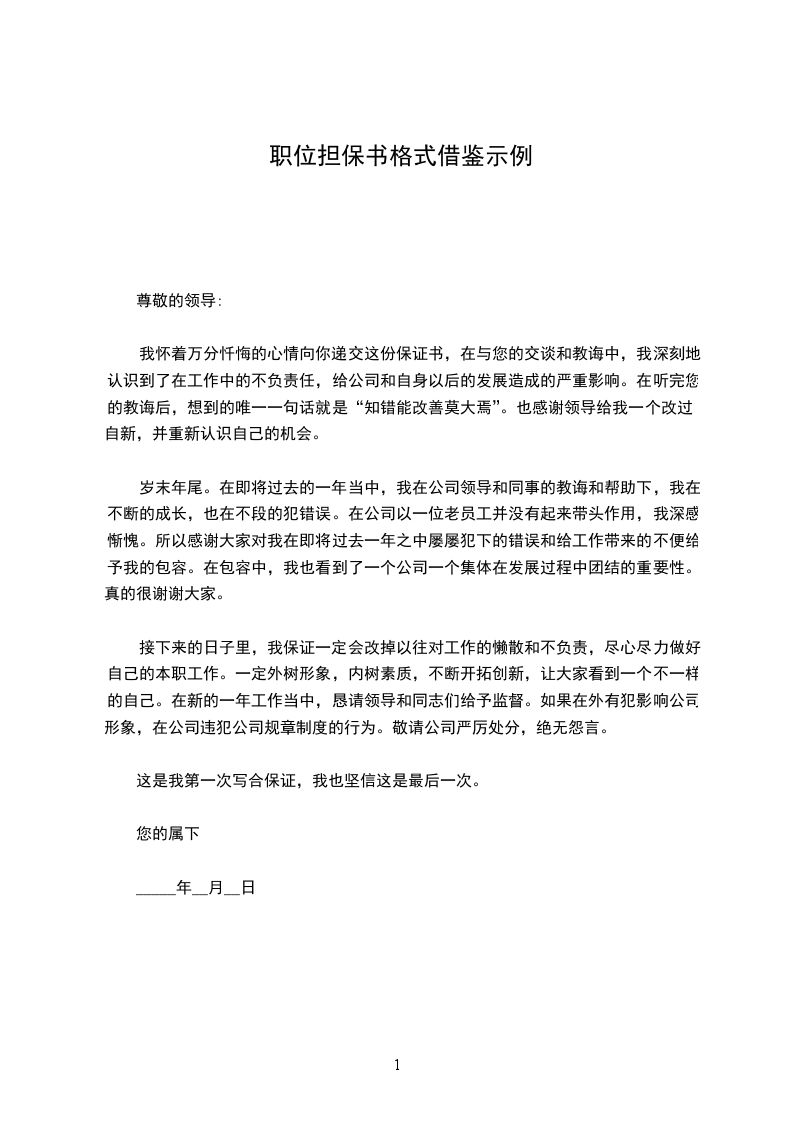 我怀着万分忏悔的心情向你递交这份保证书,在与您的交谈和教诲中,我深刻地认识到了在工作中的不负责任,给公司和自身以后的发展造成的严重影响。在听完您的教诲后,想到的唯一一句话就是“知错能改善莫大焉”。也感谢领导给我一个改过自新,并重新认识自己的机会。