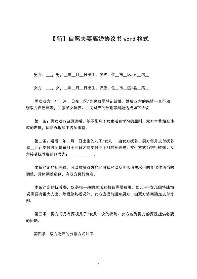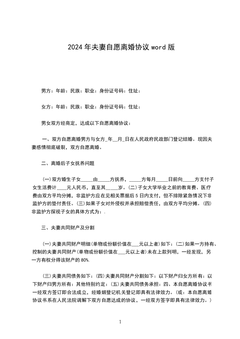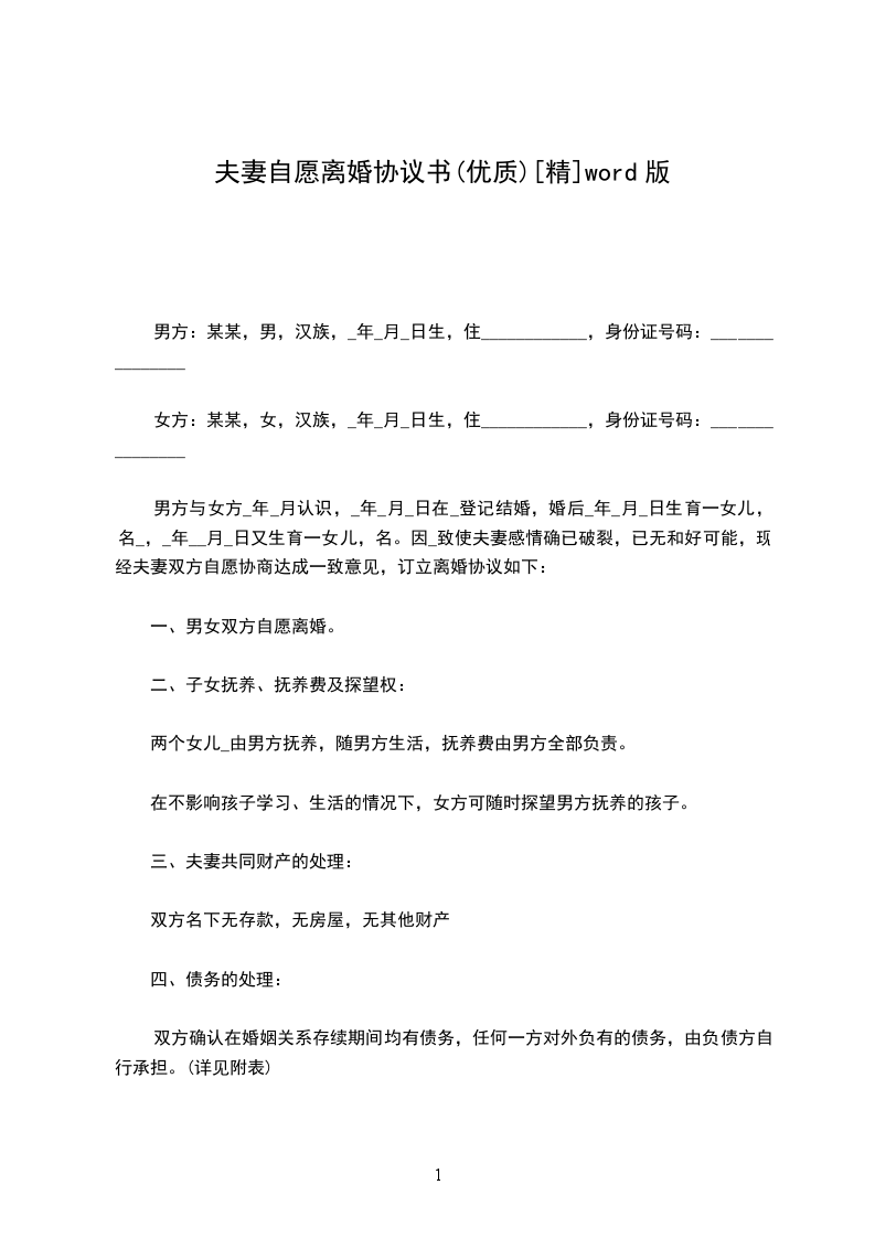 夫妻自愿离婚协议男方姓名:__________,民族:_____,身份证号:____________________,住址:_________________________________。