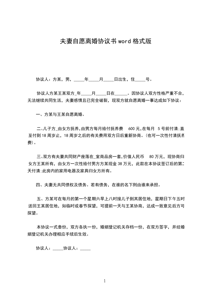 本协议双方均自愿履行,任何一方违反本协议,均自愿赔偿对方______万元。以上协议是双方真实的意思表示,不存在受到胁迫、欺诈、误解情形。协议一式___份,当事人双方各执___份,交婚姻登记机关存档备案___份。自双方在民政部门办理离婚登记后生效。