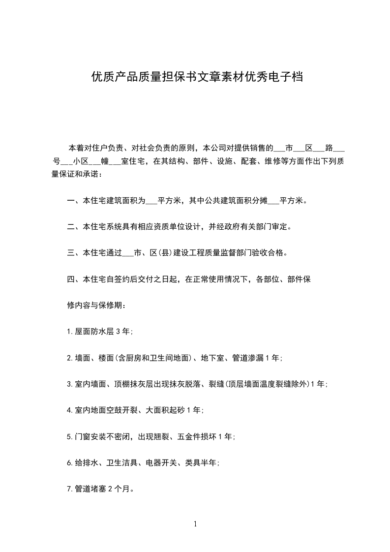 本着对住户负责、对社会负责的原则,本公司对提供销售的___市___区___路___号___小区___幢___室住宅,在其结构、部件、设施、配套、维修等方面作出下列质量保证和承诺: