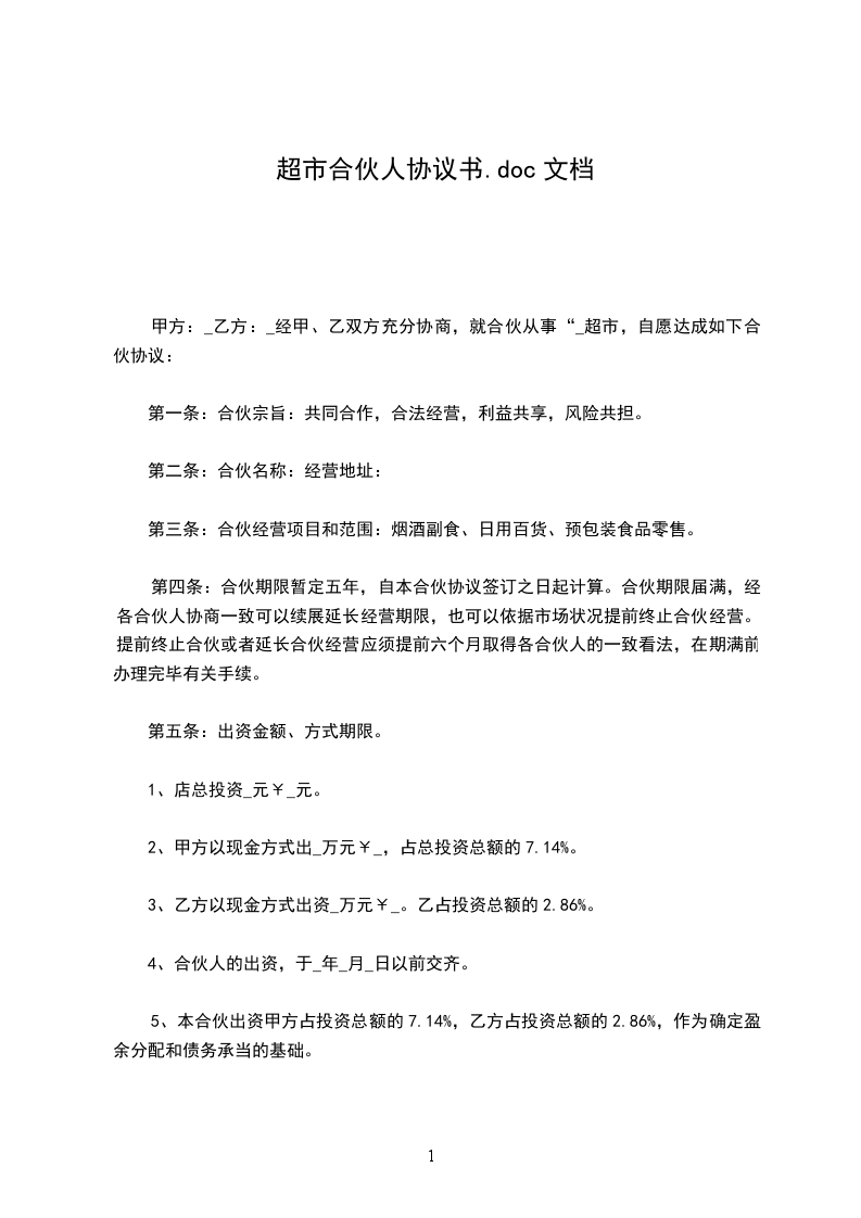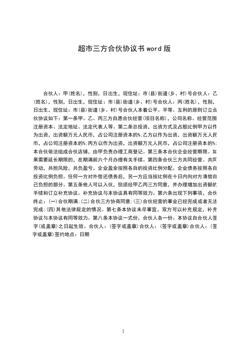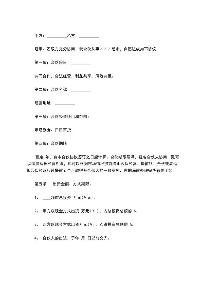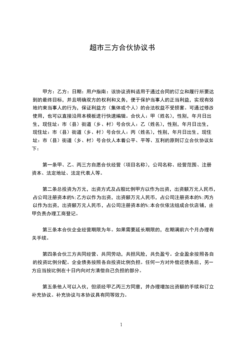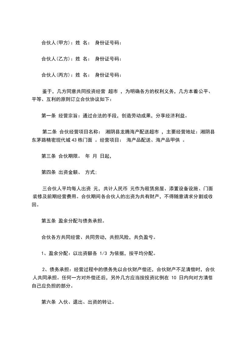 鉴于,几方同意共同投资经营 超市 ,为明确各方的权利义务,几方本着公平、平等、互利的原则订立合伙协议如下: