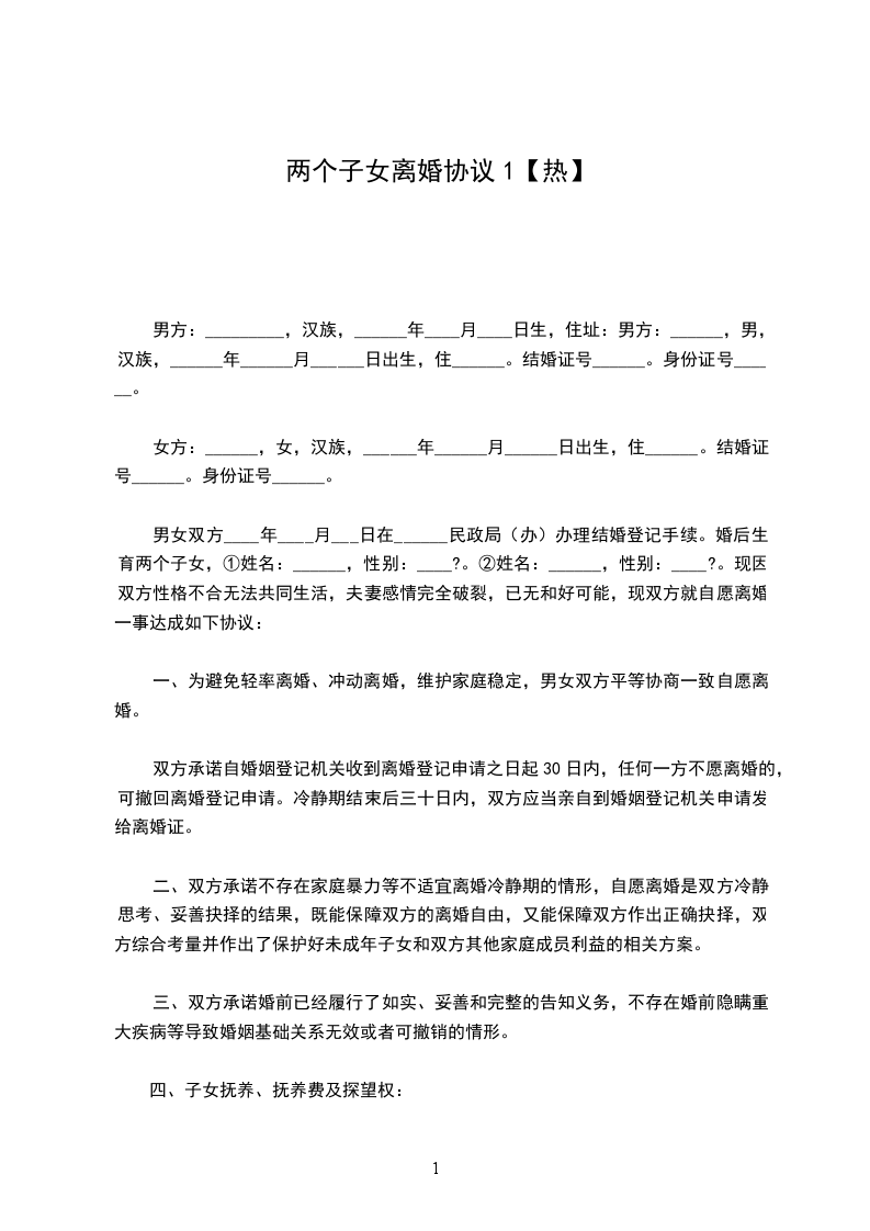 男女双方____年____月___日在______民政局(办)办理结婚登记手续。婚后生育两个子女,①姓名:______,性别:____?。②姓名:______,性别:____?。现因双方性格不合无法共同生活,夫妻感情完全破裂,已无和好可能,现双方就自愿离婚一事达成如下协议: