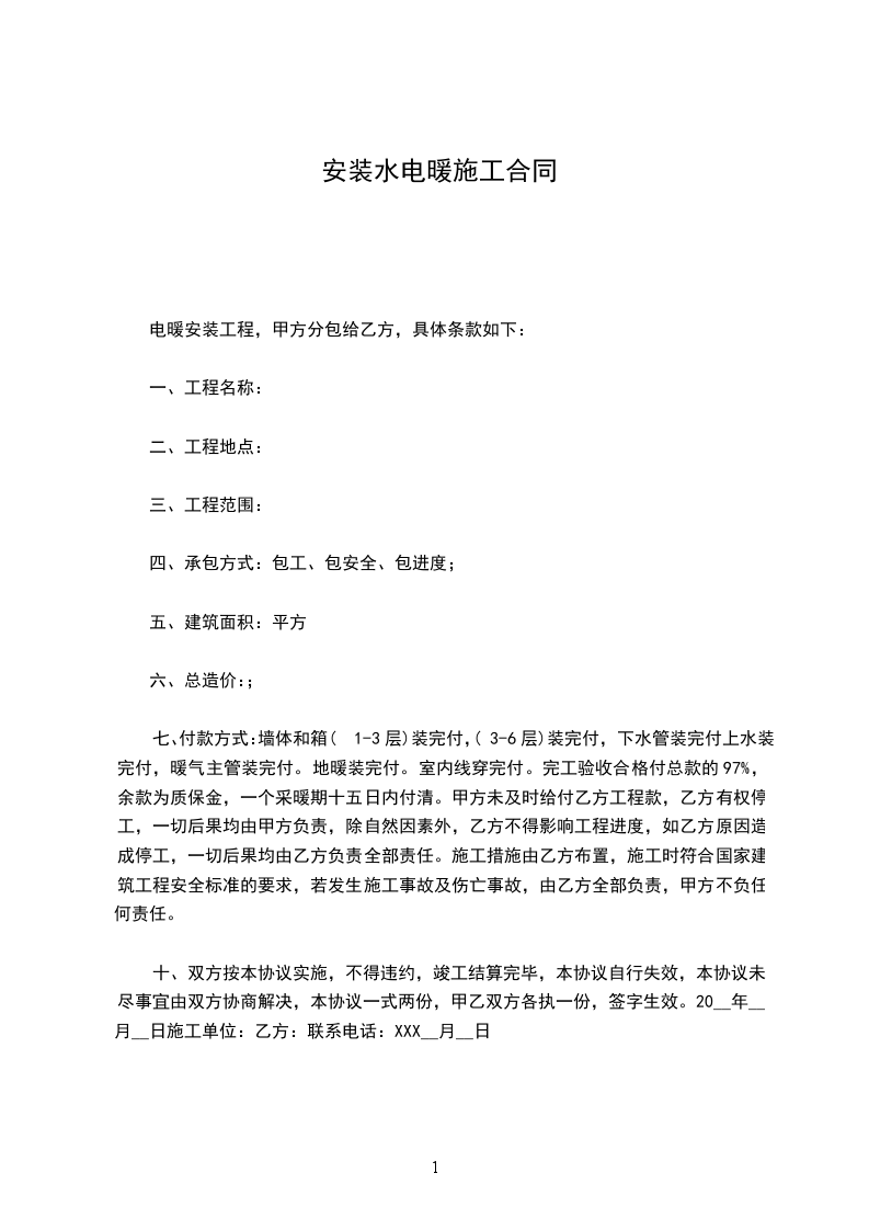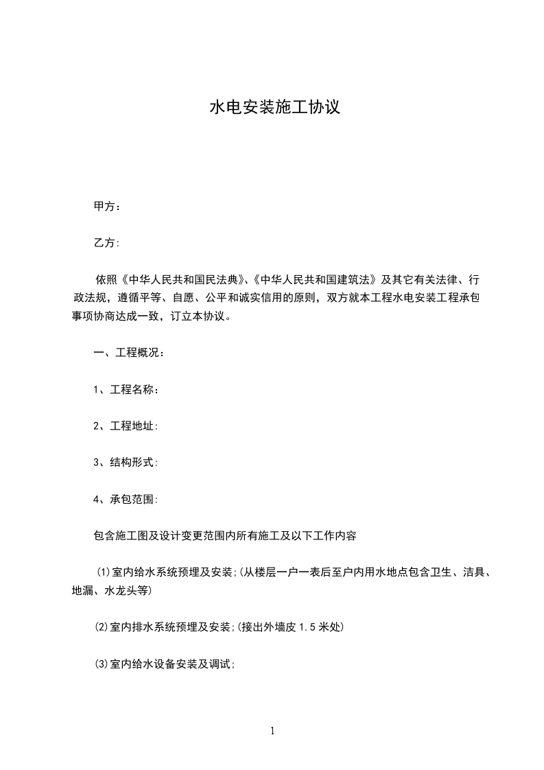 依照《中华人民共和国民法典》、《中华人民共和国建筑法》及其它有关法律、行政法规,遵循平等、自愿、公平和诚实信用的原则,双方就本工程水电安装工程承包事项协商达成一致,订立本协议。