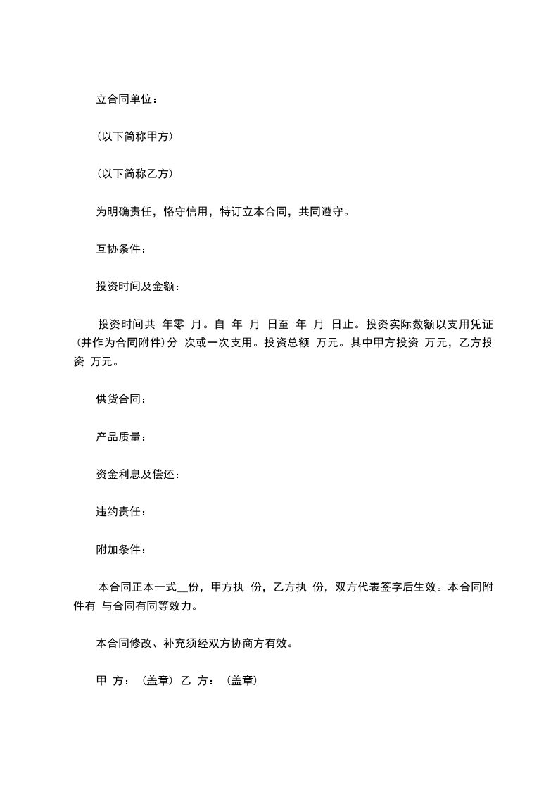 投资时间共 年零 月。自 年 月 日至 年 月 日止。投资实际数额以支用凭证(并作为合同附件)分 次或一次支用。投资总额 万元。其中甲方投资 万元,乙方投资 万元。