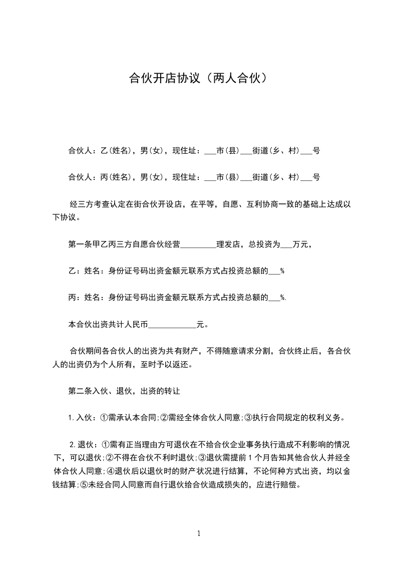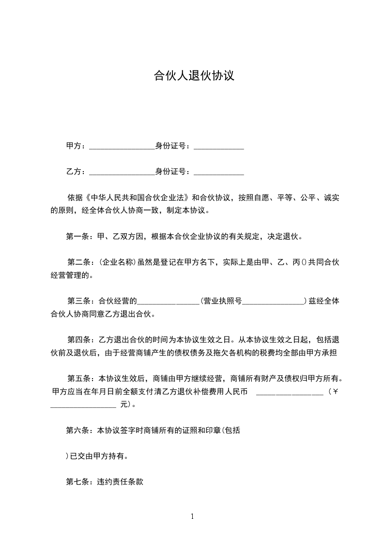 第一条甲乙双方合伙经营的铺号(________行)(设________处所)(营业执照____________字批____号)兹经甲乙双方协议同意以______年____月____日甲方为退伙,而脱离合伙关系是实。