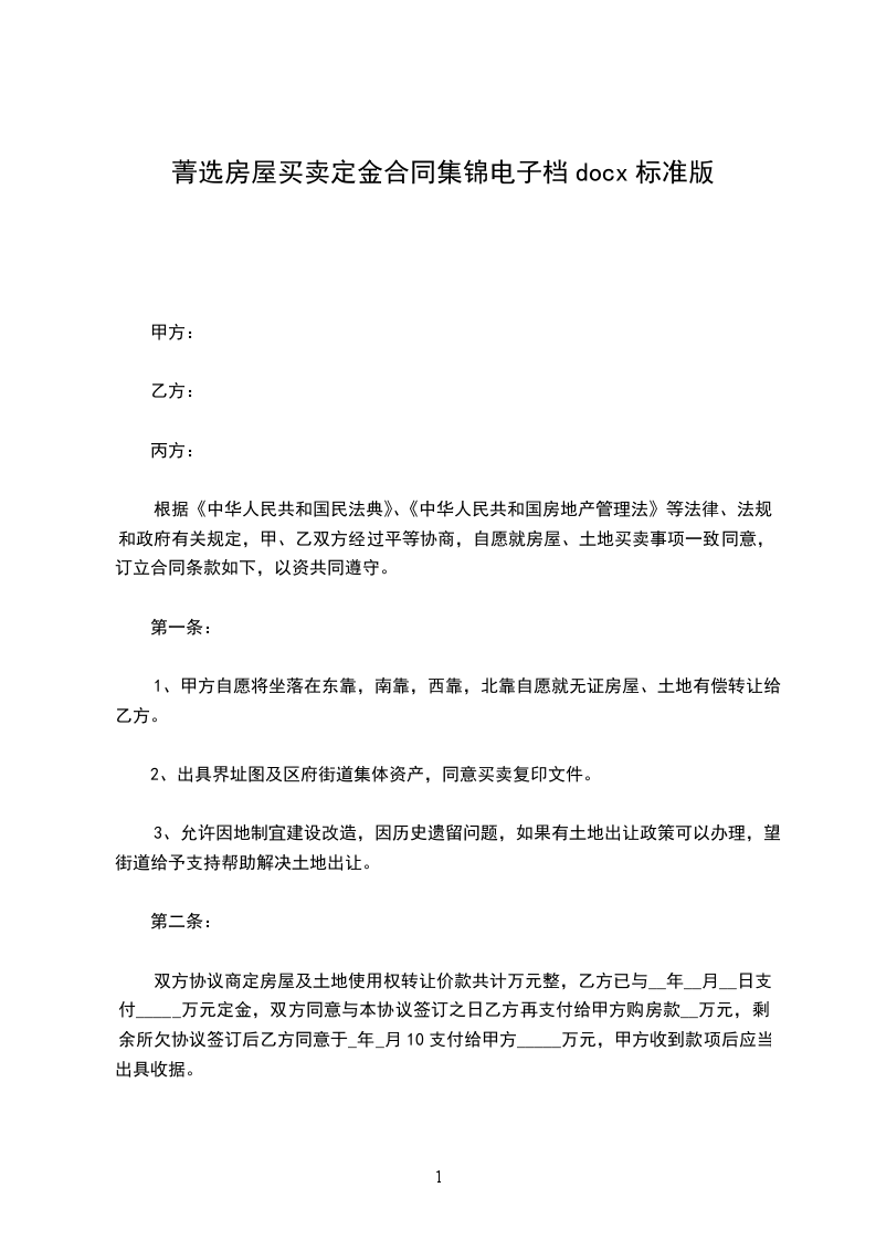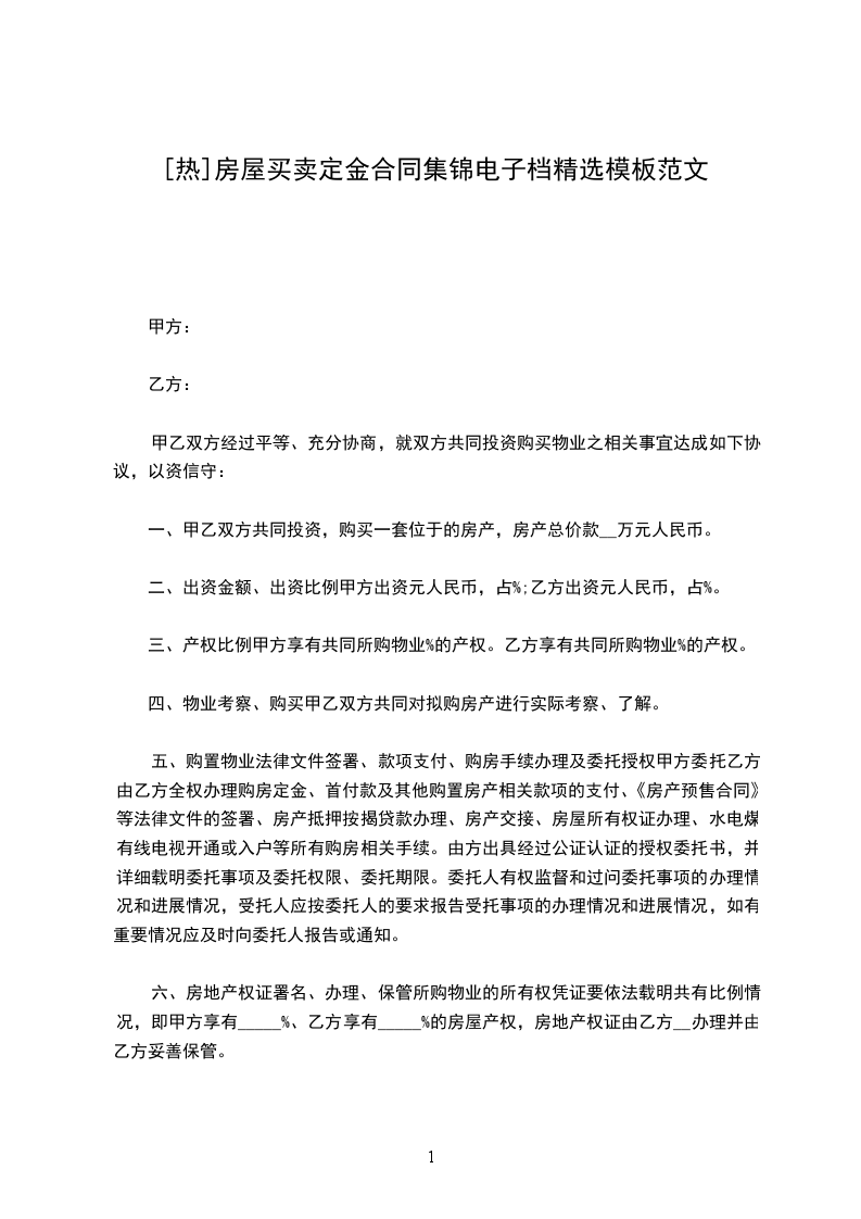 1、购房首付款_元(包括定金)人民币(房款总价款的__%)由甲方付%、乙方付%,并以现金支付;