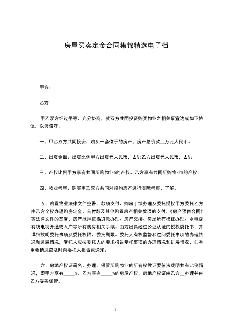 甲乙双方经过平等、充分协商,就双方共同投资购买物业之相关事宜达成如下协议,以资信守: