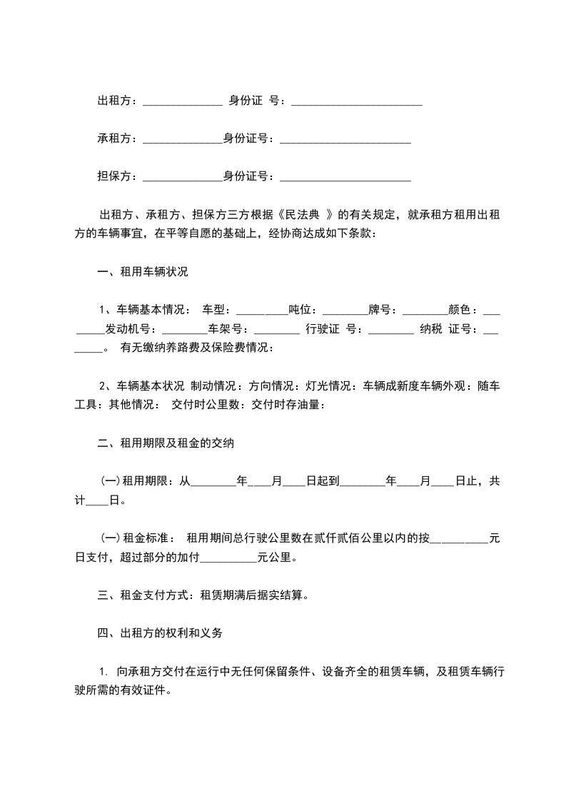 出租方、承租方、担保方三方根据《民法典 》的有关规定,就承租方租用出租方的车辆事宜,在平等自愿的基础上,经协商达成如下条款:
