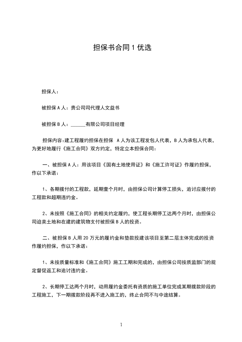 担保内容:建工程履约担保在担保A人为该工程发包人代表,B人为承包人代表,为更好地履行《施工合同》双方约定,特定立本担保合同: