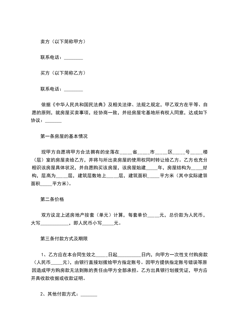 第三条付款时间与办法:甲乙双方同意以一次性付款方式付款,本合同签定之日,乙方向甲方支付人民币__________元整,作为购房定金。并约定在本合同签订之日起______日内支付首付款人民币____拾____万____仟____佰____拾____元整给甲方,剩余房款人民币____________元整于产权交割完毕当日付给甲方。甲方应于拿到房产证之日起____天内和乙方办理房屋产权过户手续,并应在产权过户手续办完当日将_________等费用结清。税费分担甲乙双方应遵守国家房地产政策、法规,并按规定缴纳办理房地产过户手续所需缴纳的税费。经双方协商,一切交易税费由_______方承担。