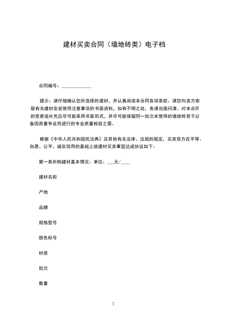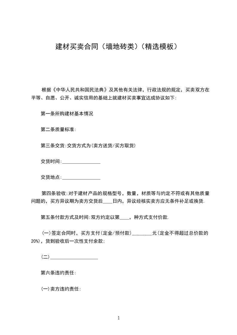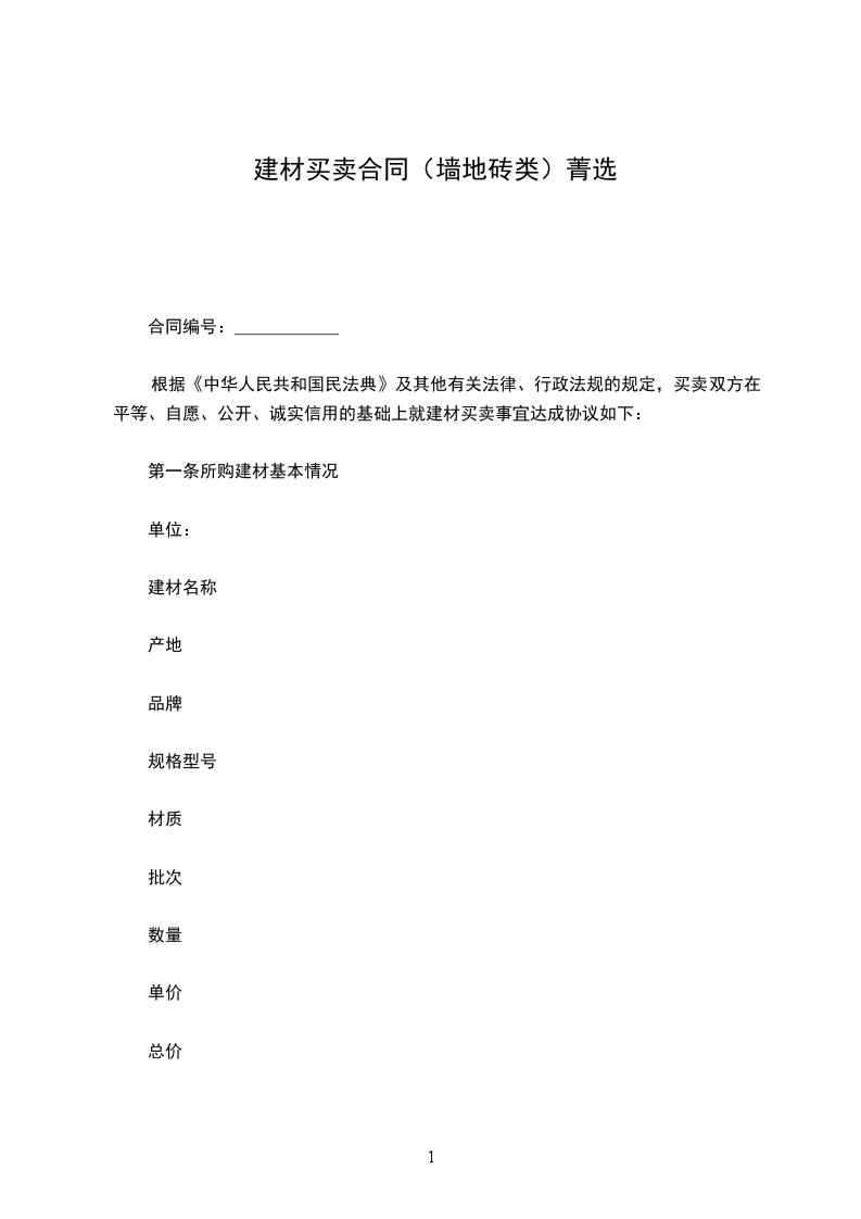 根据《中华人民共和国民法典》及其他有关法律、行政法规的规定,买卖双方在平等、自愿、公开、诚实信用的基础上就建材买卖事宜达成协议如下: