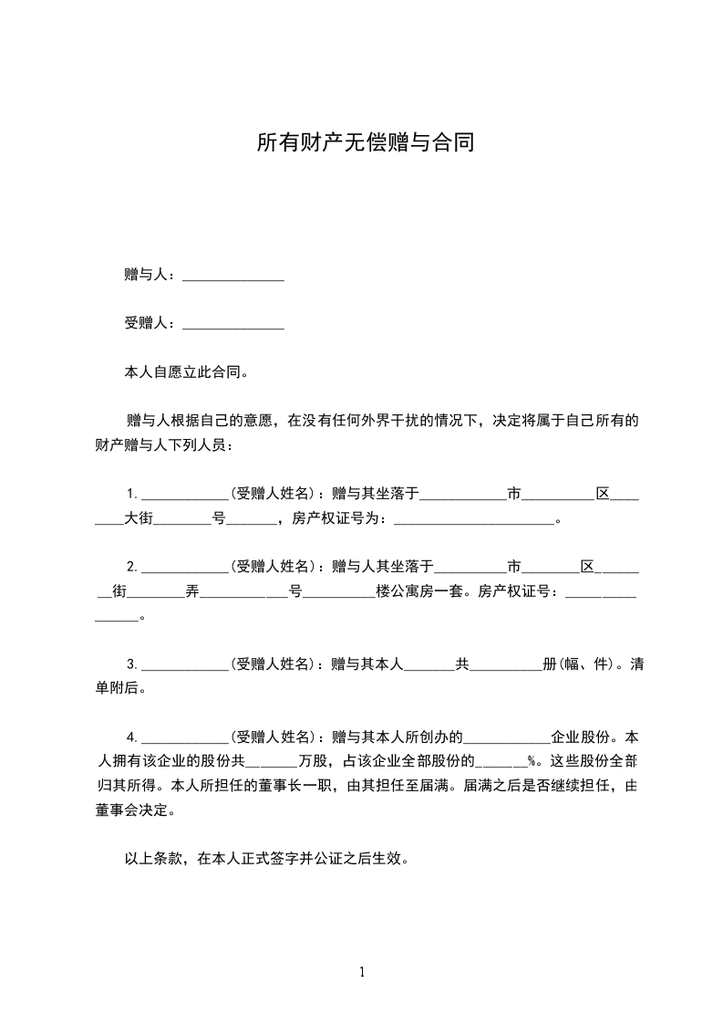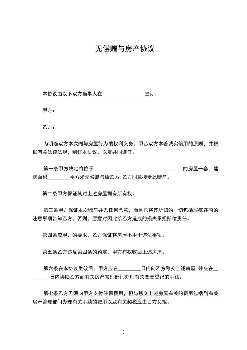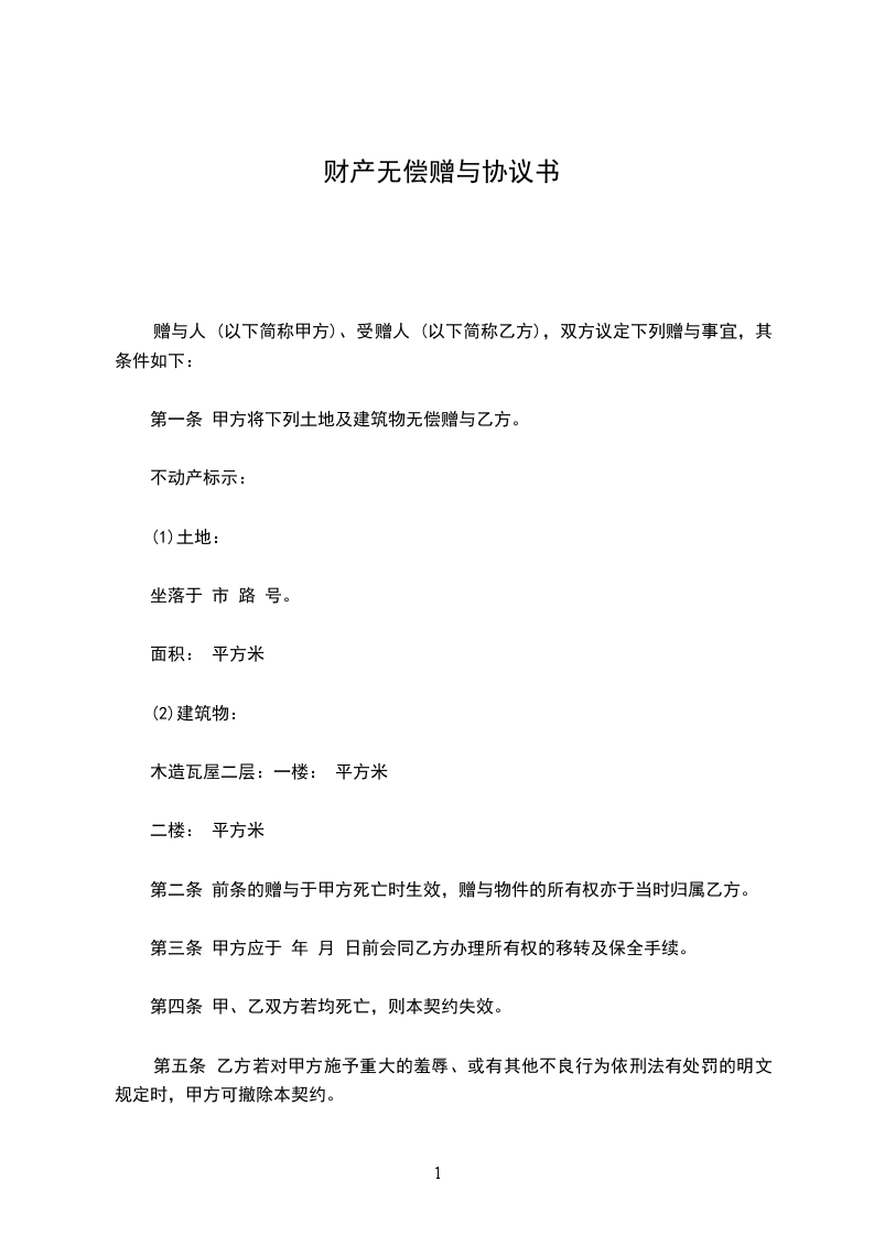 第一条 甲方将下列土地及建筑物无偿赠与乙方。