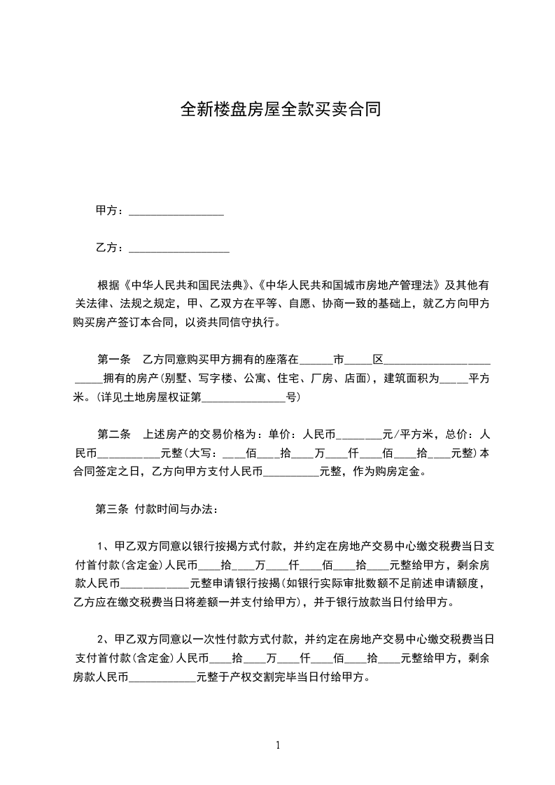 根据《中华人民共和国民法典》、《中华人民共和国城市房地产管理法》及其他有关法律、法规之规定,甲、乙双方在平等、自愿、协商一致的基础上,就乙方向甲方购买房产签订本合同,以资共同信守执行,达成如下协议: