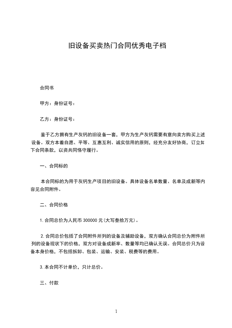 2.在乙方一次性付清设备协定款后,乙方将拥有此设备的一切权利,从此旧设备与甲方无任何关联,乙方一次性付清购机款,表明甲、乙双方对此旧设备的买卖协议正式生效,旧设备买卖程序结束,旧设备全部产权实现了自动转移。