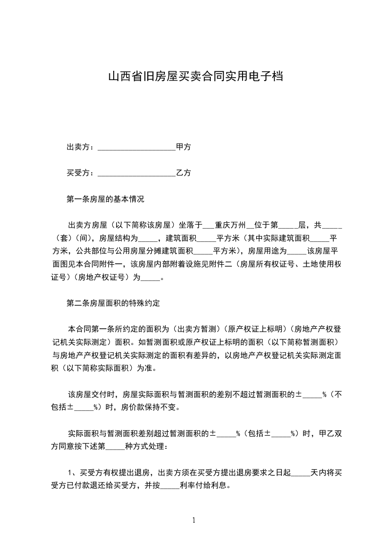 本合同第一条所约定的面积为(出卖方暂测)(原产权证上标明)(房地产产权登记机关实际测定)面积。如暂测面积或原产权证上标明的面积(以下简称暂测面积)与房地产产权登记机关实际测定的面积有差异的,以房地产产权登记机关实际测定面积(以下简称实际面积)为准。