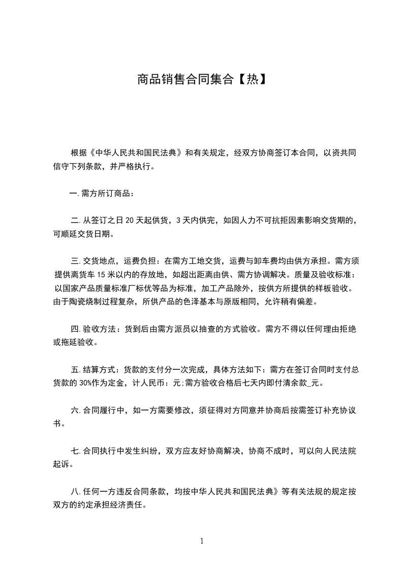 五.结算方式:货款的支付分一次完成,具体方法如下:需方在签订合同时支付总货款的30%作为定金,计人民币:元;需方验收合格后七天内即付清余款_元。