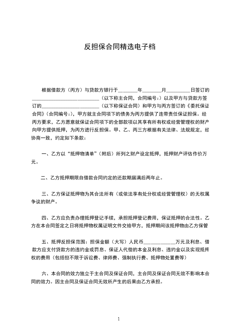 4、抵押物无第三人主张权利或提出异议。十六、在抵押期间,乙方发生合并、分立、变更、撤销、破产、法定代表人变更等情况,其合并、分立、变更后的法人或其它组织仍继续承担或连带承担本合同项下的反担保责任。