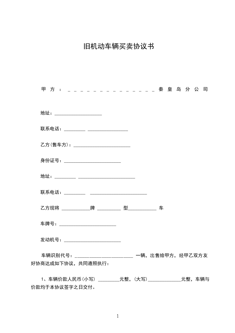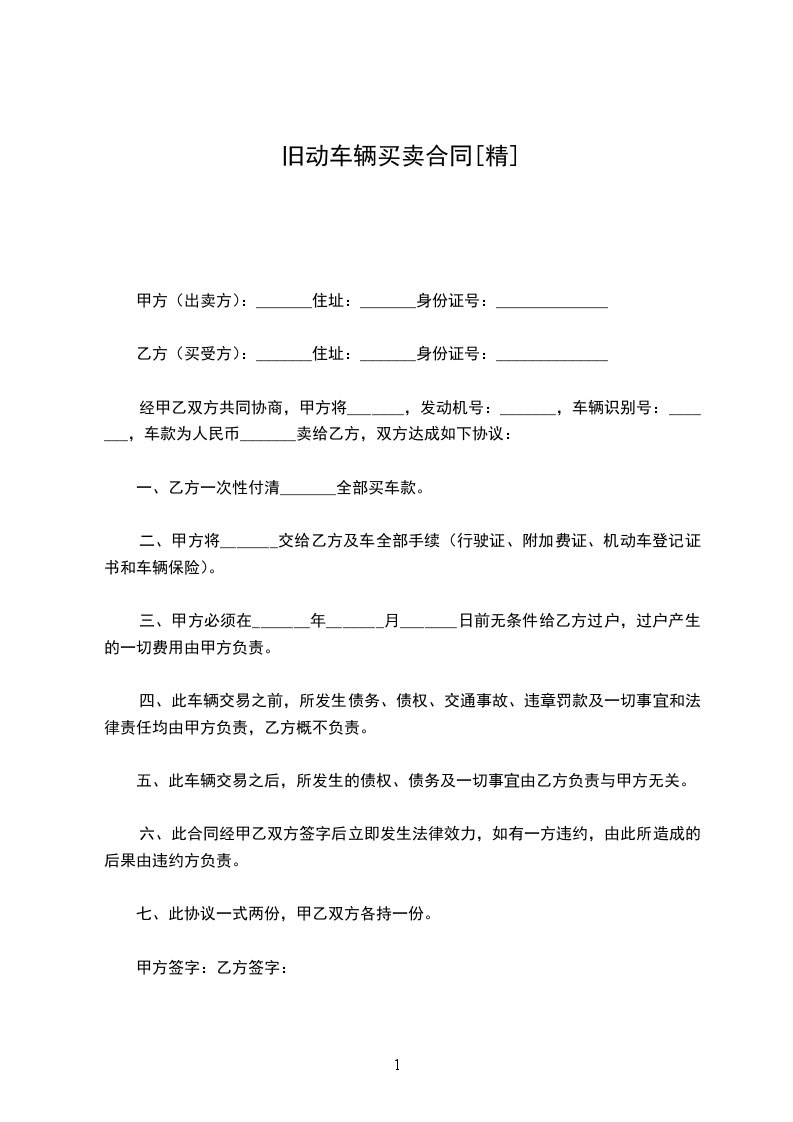经甲乙双方共同协商,甲方将_______,发动机号:_______,车辆识别号:_______,车款为人民币_______卖给乙方,双方达成如下协议: