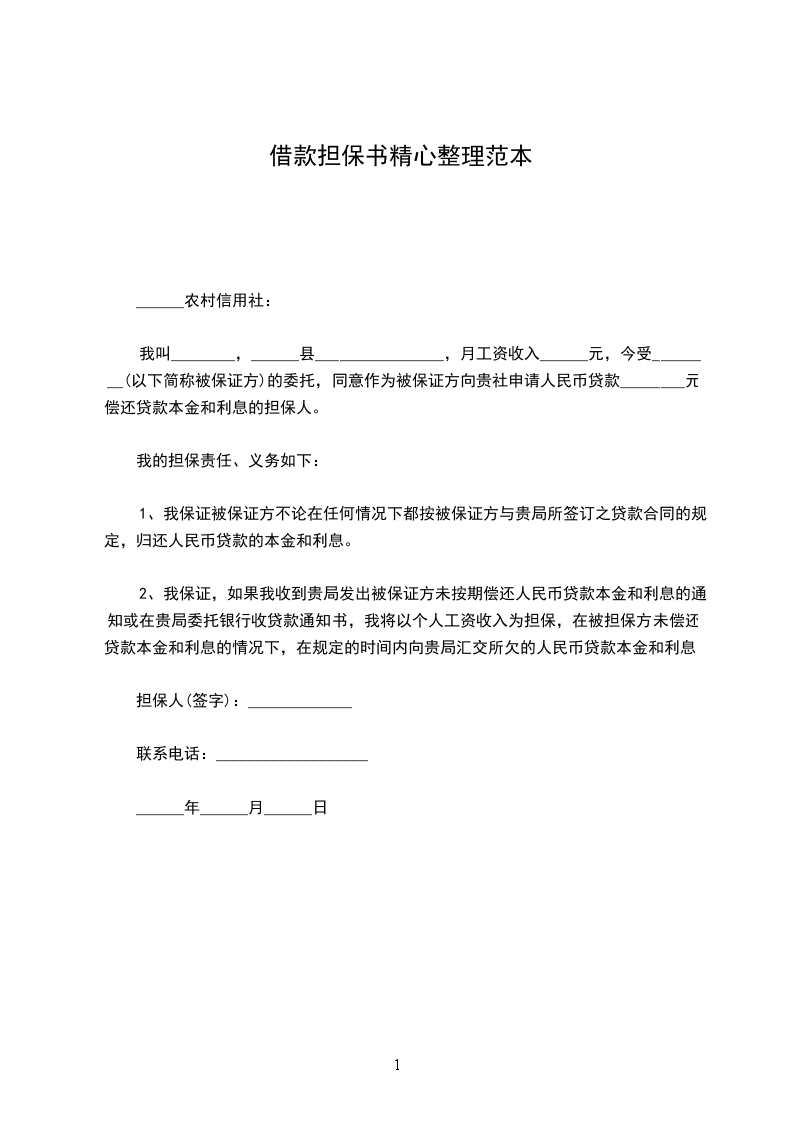我叫________,______县________________,月工资收入______元,今受________(以下简称被保证方)的委托,同意作为被保证方向贵社申请人民币贷款________元偿还贷款本金和利息的担保人。