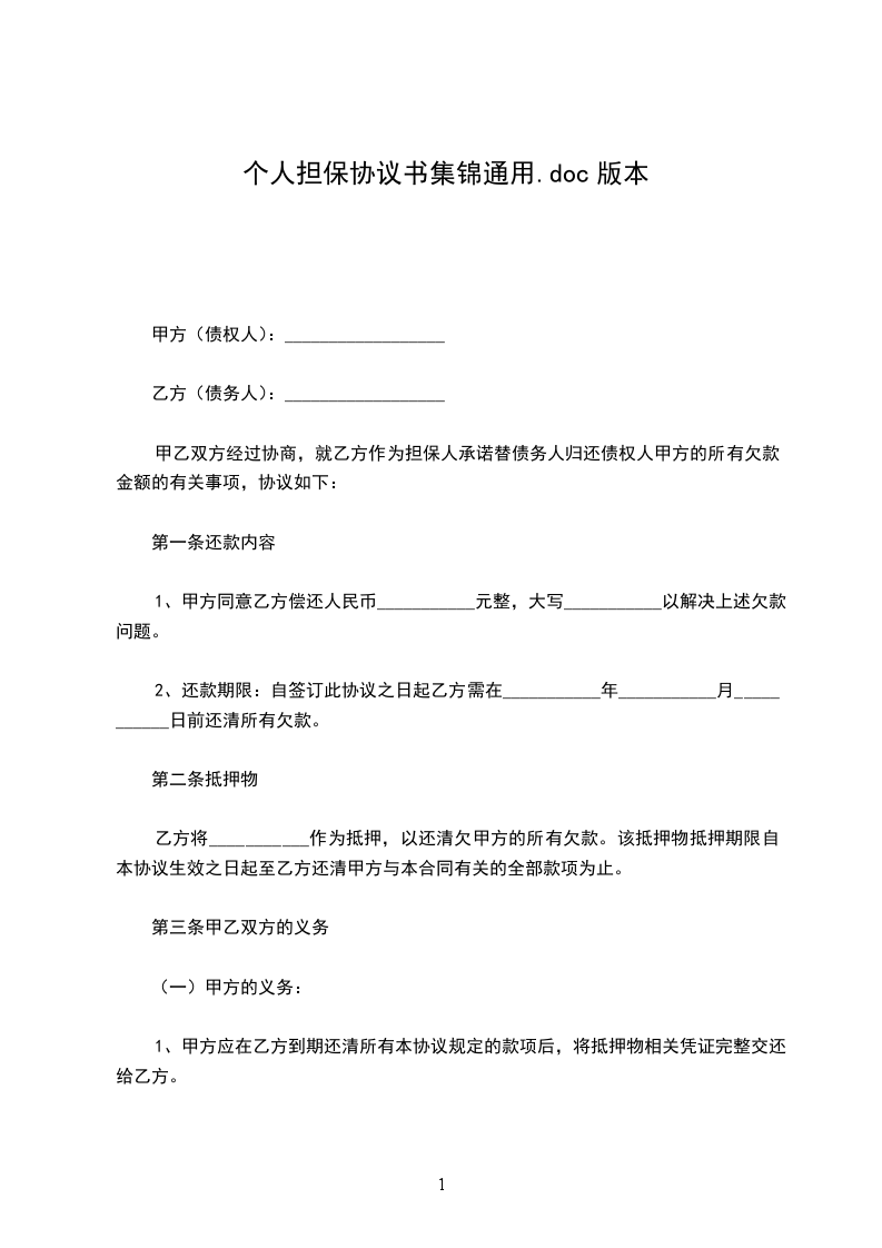 甲乙双方经过协商,就乙方作为担保人承诺替债务人归还债权人甲方的所有欠款金额的有关事项,协议如下: