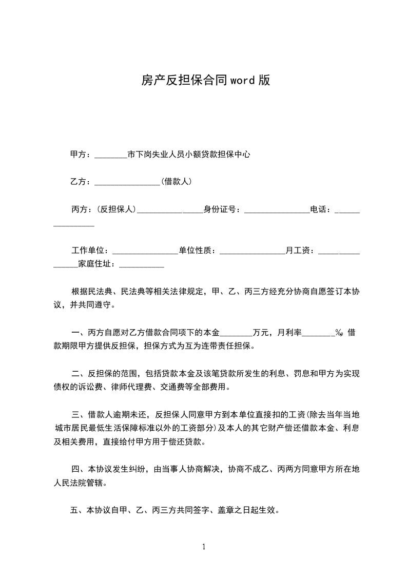一、丙方自愿对乙方借款合同项下的本金________万元,月利率________‰,借款期限甲方提供反担保,担保方式为互为连带责任担保。