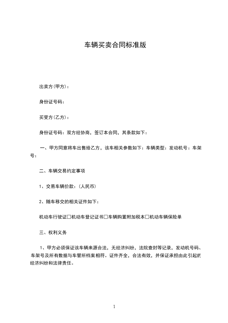 一、甲方将车主的_________车,车牌号_________,发动机号_________,车架号_________转让给乙方,双方达成成交总额为(人民币)_________整,小写_________元。乙方在此协议签订时交付甲方车辆定金(人民币)_________整,小写_________元。剩余购车款在办理完车辆过户手续之后一次性付清。