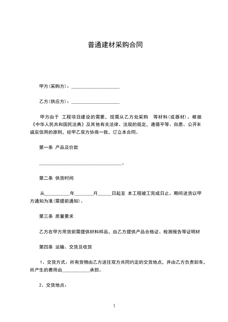 甲方由于 工程项目建设的需要,现需从乙方处采购 等材料(或器材)。根据《中华人民共和国民法典》及其他有关法律、法规的规定,遵循平等、自愿、公开和诚实信用的原则,经甲乙双方协商一致,订立本合同。
