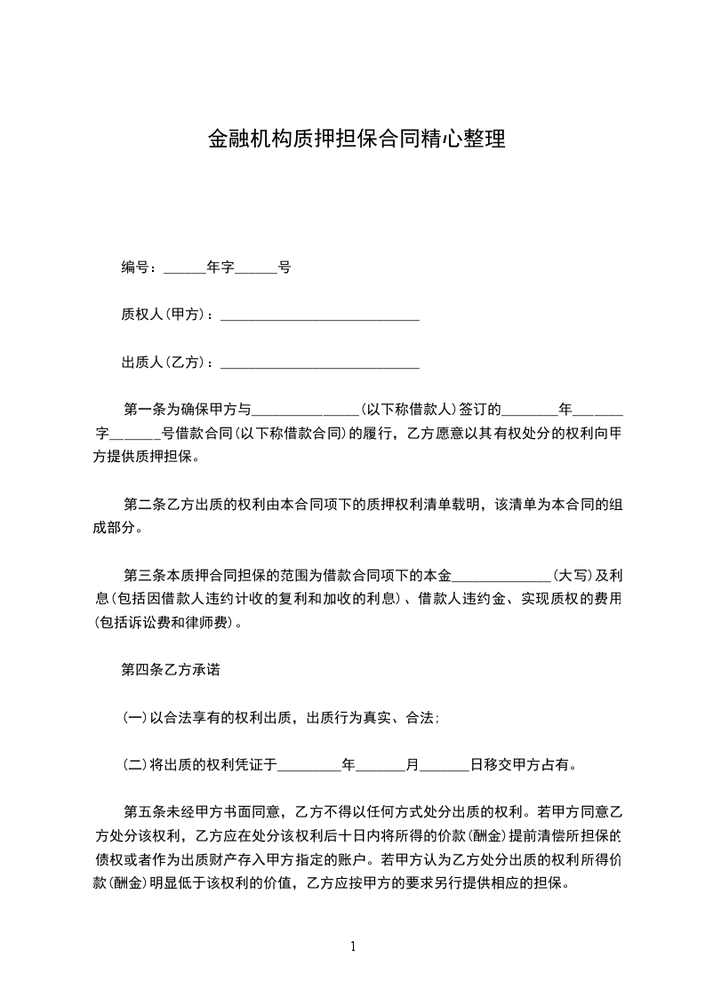 第一条为确保甲方与_______________(以下称借款人)签订的________年_______字_______号借款合同(以下称借款合同)的履行,乙方愿意以其有权处分的权利向甲方提供质押担保。