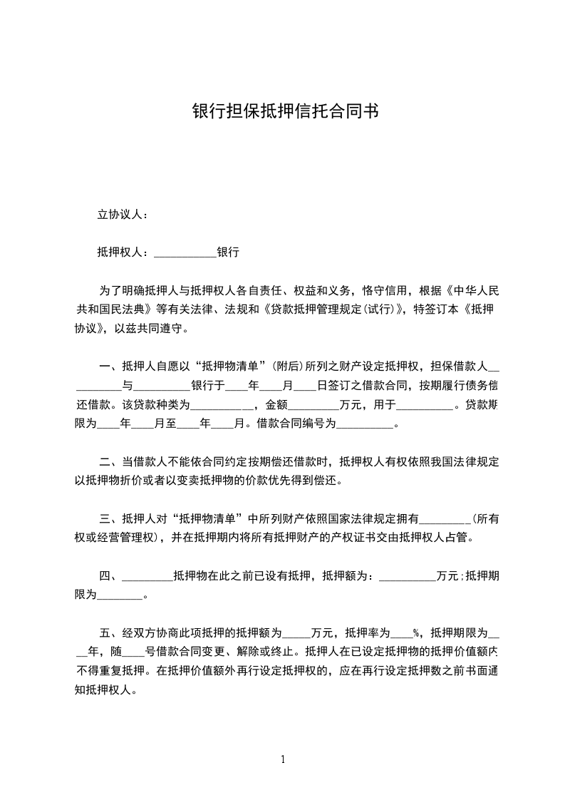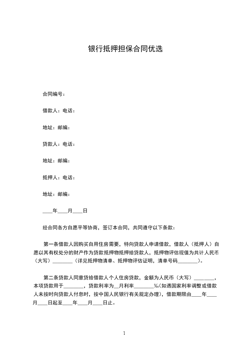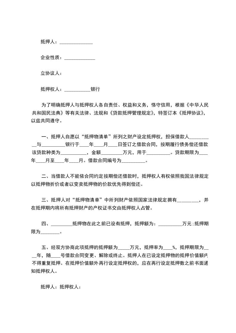 第一条借款人因购买自用住房需要,特向贷款人申请借款,借款人(抵押人)自愿以其有权处分的财产作为贷款抵押物抵押给贷款人,抵押物评估现值为共计人民币(大写)____(详见抵押物清单、抵押物评估证明,清单号码____)。