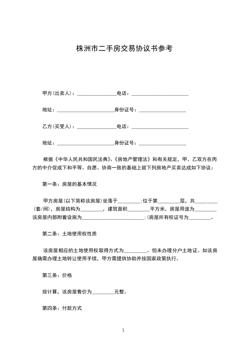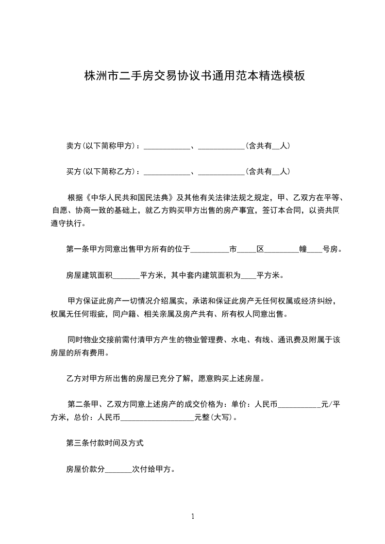 第一条乙方购买甲方坐落在_______________市__________街__________巷_________号的房屋__________栋_______间,建筑面积为______________平方米。