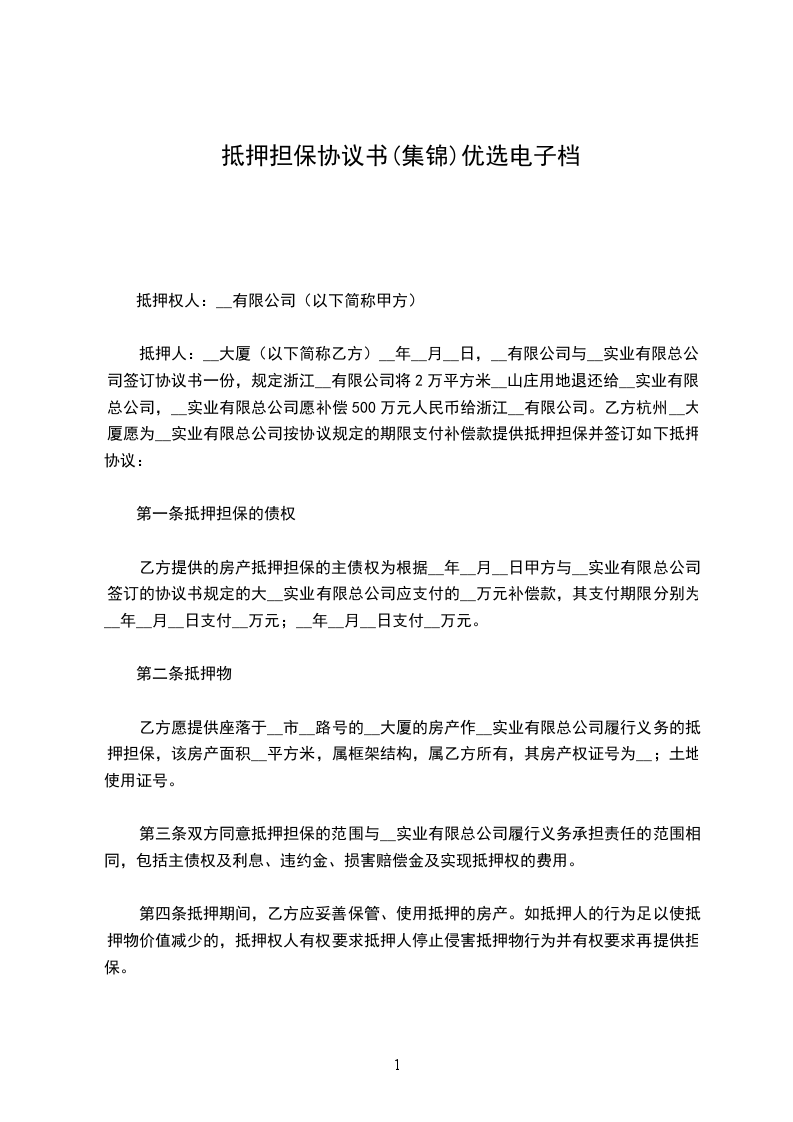 抵押人:_____大厦(以下简称乙方)___年___月___日,_____有限公司与______实业有限总公司签订协议书一份,规定浙江___有限公司将2万平方米___山庄用地退还给______实业有限总公司,______实业有限总公司愿补偿500万元人民币给浙江___有限公司。乙方杭州___大厦愿为______实业有限总公司按协议规定的期限支付补偿款提供抵押担保并签订如下抵押协议: