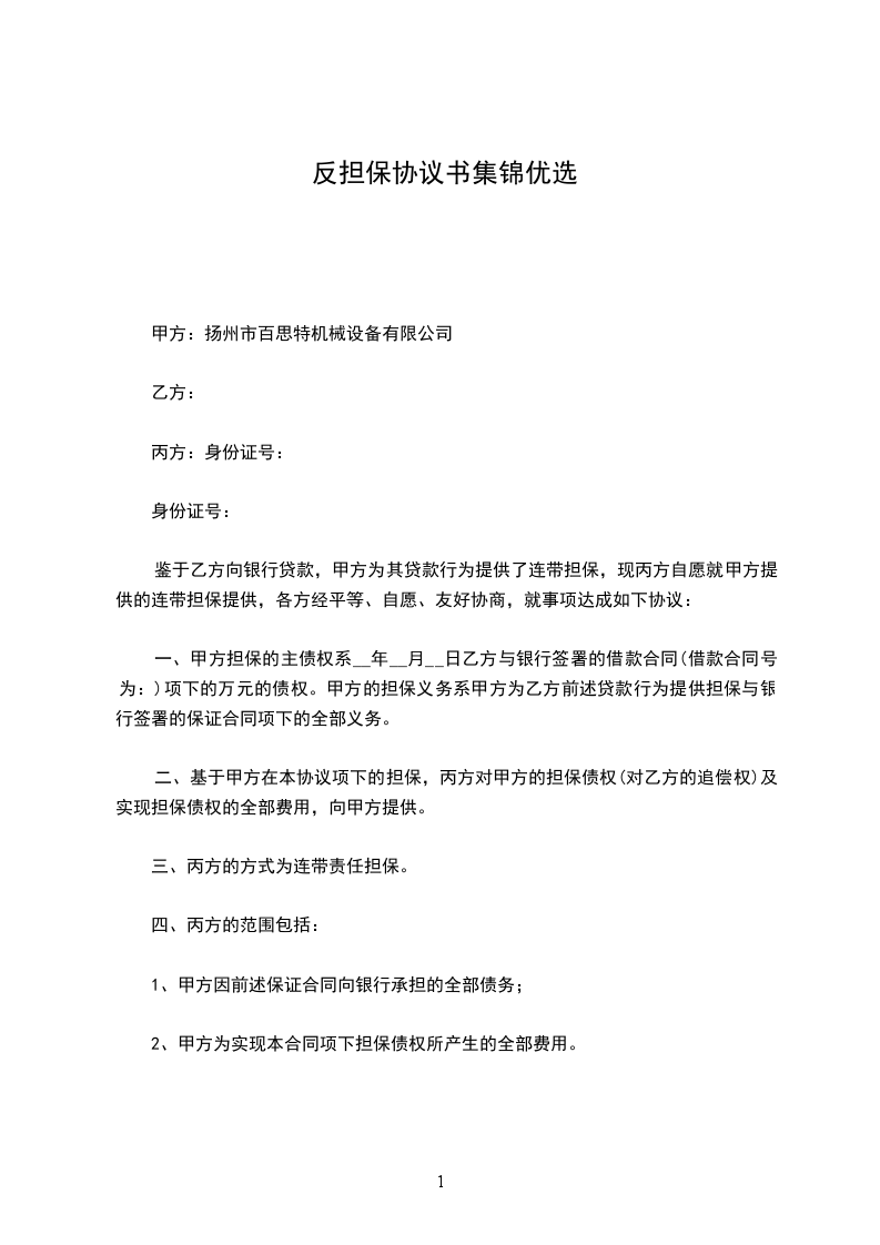 鉴于乙方向银行贷款,甲方为其贷款行为提供了连带担保,现丙方自愿就甲方提供的连带担保提供,各方经平等、自愿、友好协商,就事项达成如下协议: