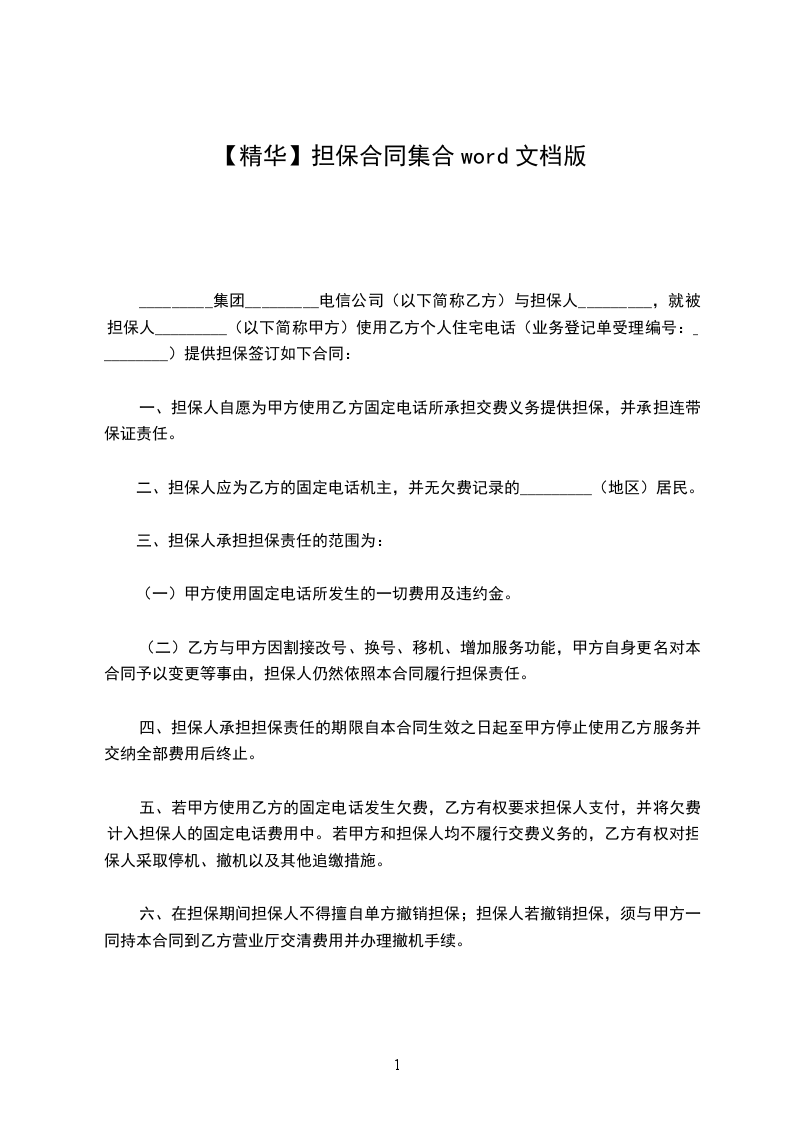 _________集团_________电信公司(以下简称乙方)与担保人_________,就被担保人_________(以下简称甲方)使用乙方个人住宅电话(业务登记单受理编号:_________)提供担保签订如下合同: