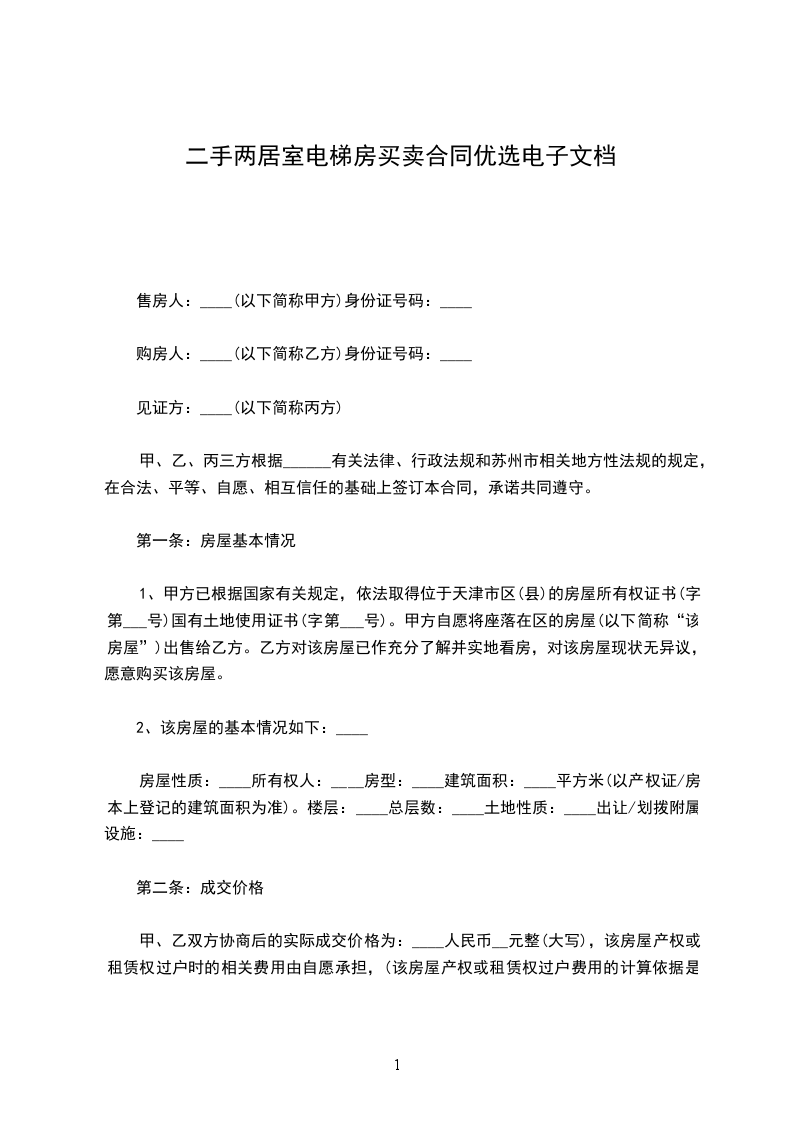 1、甲方已根据国家有关规定,依法取得位于天津市区(县)的房屋所有权证书(字第___号)国有土地使用证书(字第___号)。甲方自愿将座落在区的房屋(以下简称“该房屋”)出售给乙方。乙方对该房屋已作充分了解并实地看房,对该房屋现状无异议,愿意购买该房屋。