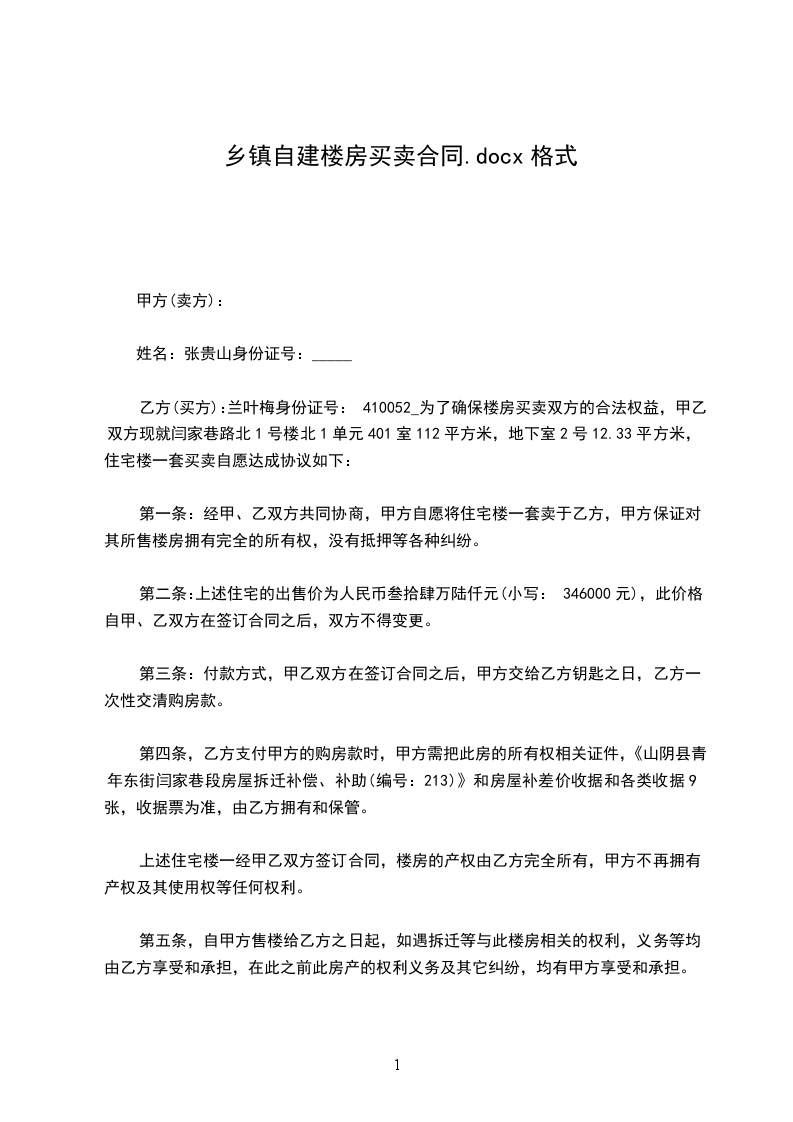 乙方(买方):兰叶梅身份证号:410052_为了确保楼房买卖双方的合法权益,甲乙双方现就闫家巷路北1号楼北1单元401室112平方米,地下室2号12.33平方米,住宅楼一套买卖自愿达成协议如下: