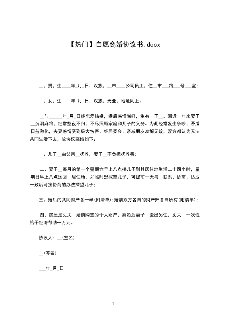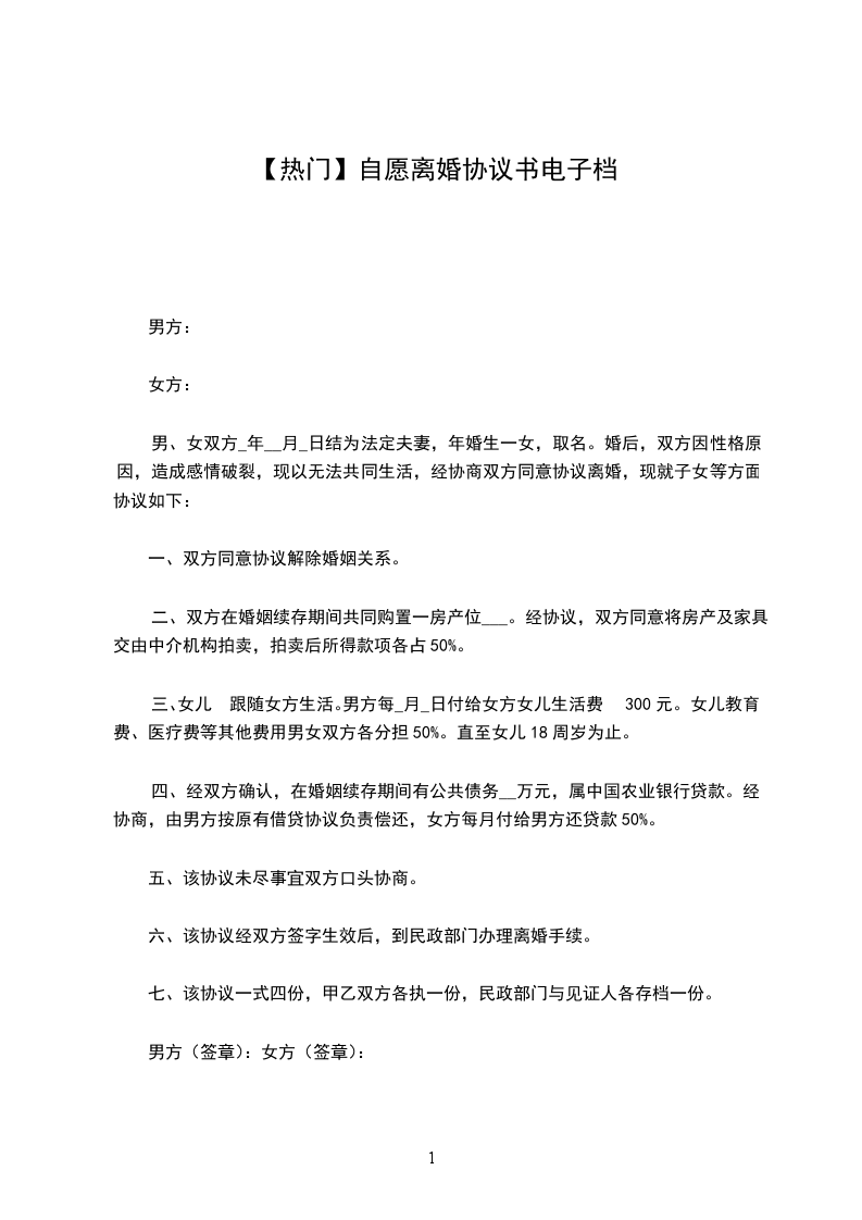 男女双方_________年_________月_________日结婚,_________年_________月生一女(子)_________,现就离婚事宜达成如下协议,供双方遵照执行: