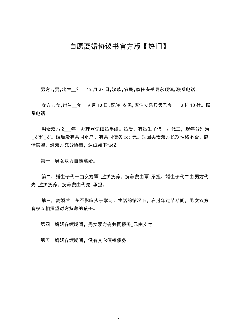 女方:_________,_________族,_________岁,_________省_________人。
