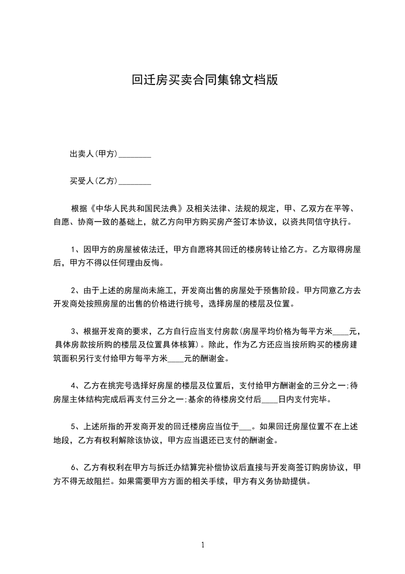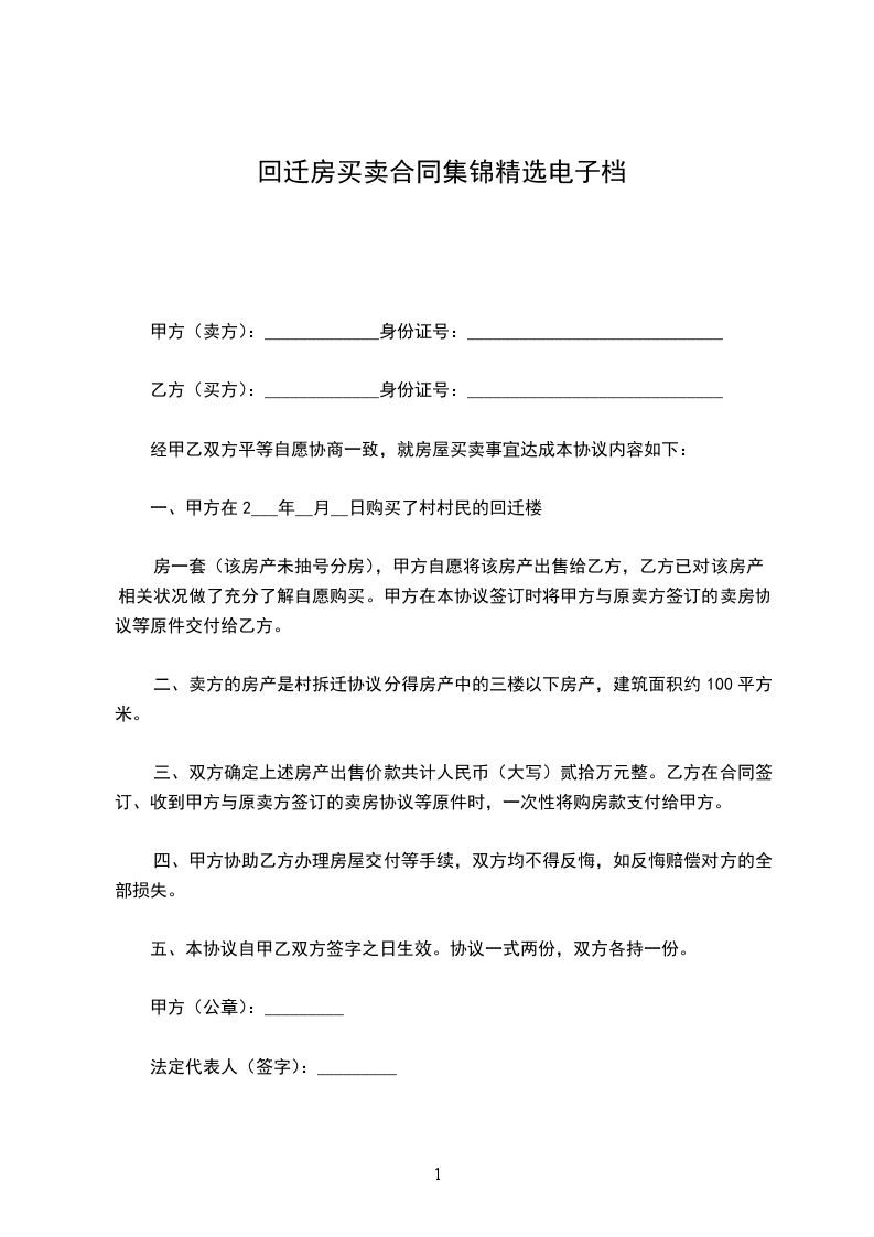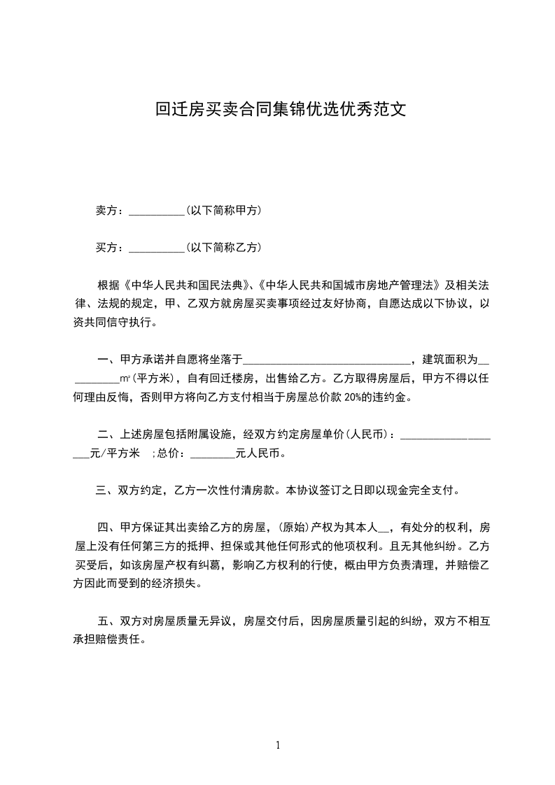 一、甲方承诺并自愿将坐落于______________________________,建筑面积为__________㎡(平方米),自有回迁楼房,出售给乙方。乙方取得房屋后,甲方不得以任何理由反悔,否则甲方将向乙方支付相当于房屋总价款20%的违约金。