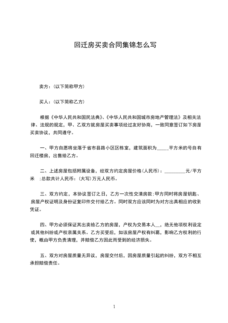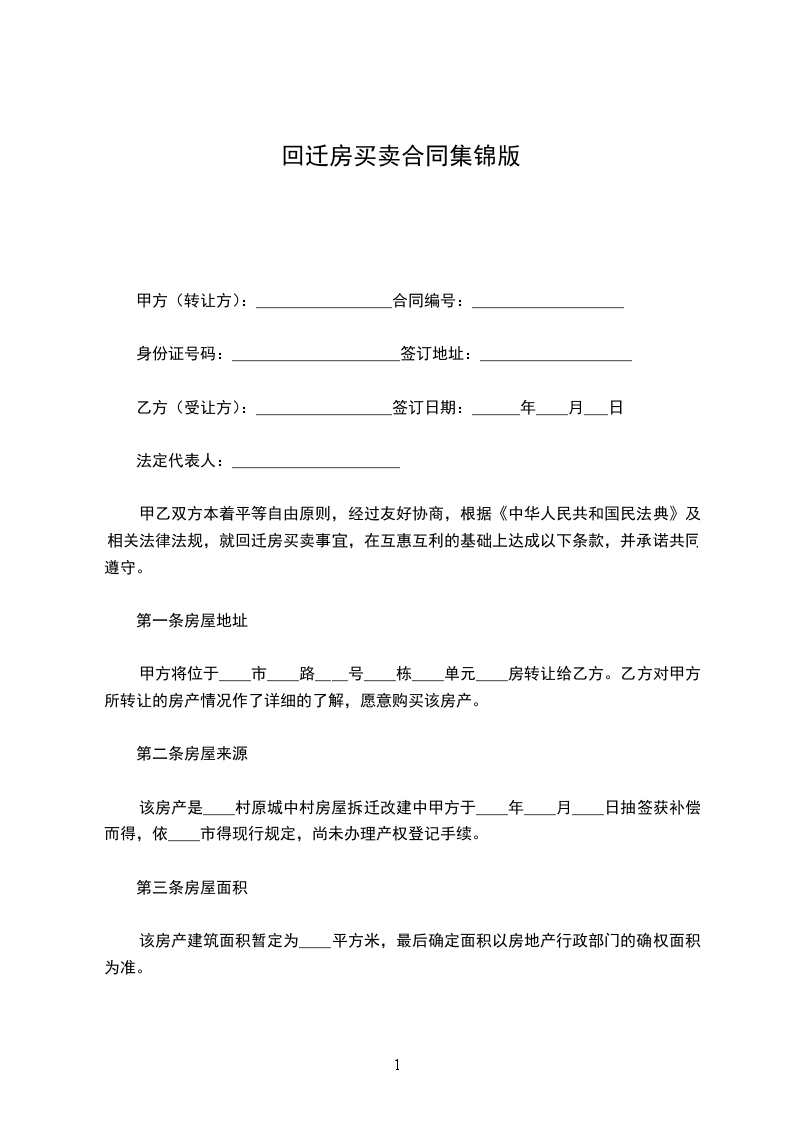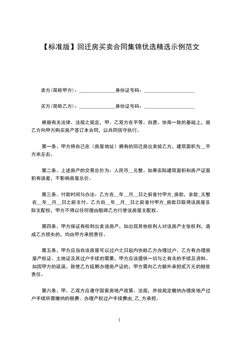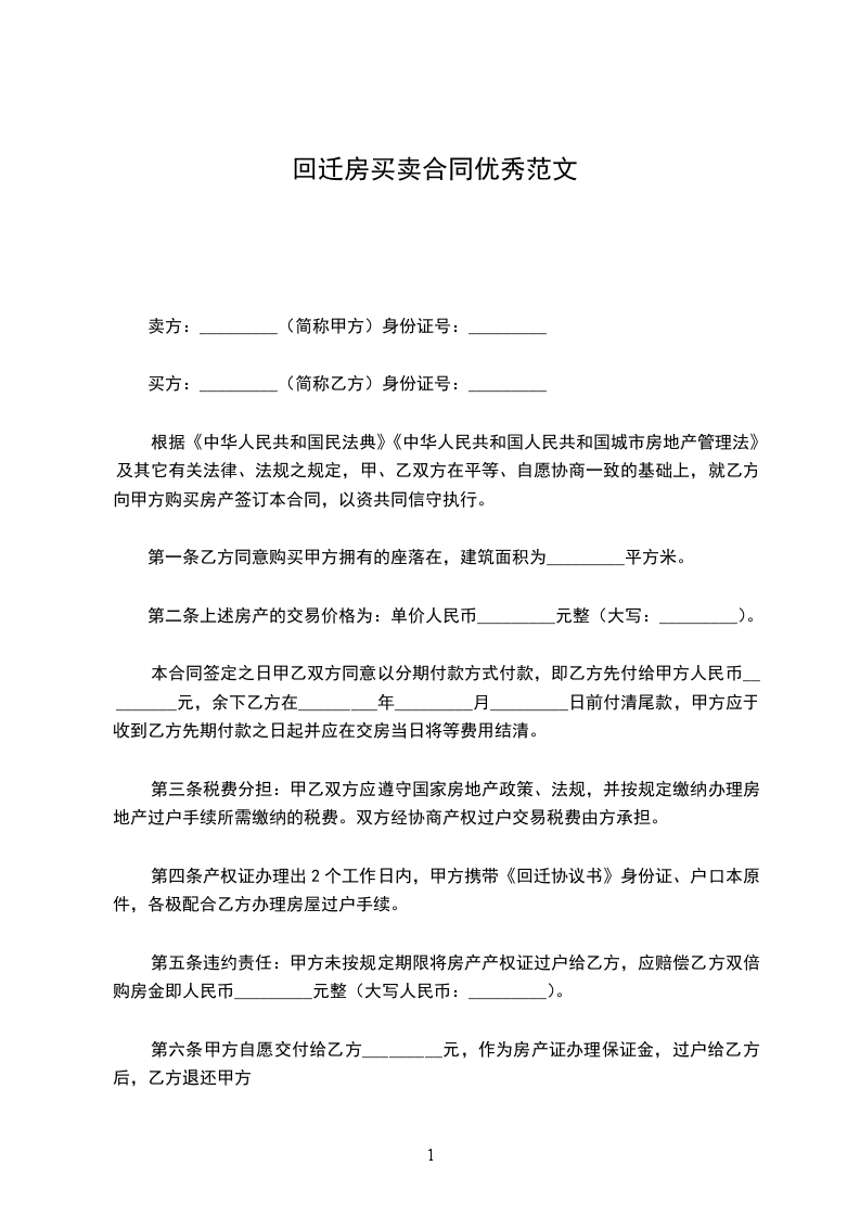 一、甲方承诺并自愿将坐落于______________________________,建筑面积为__________㎡(平方米),自有回迁楼房,出售给乙方。乙方取得房屋后,甲方不得以任何理由反悔,否则甲方将向乙方支付相当于房屋总价款20%的违约金。
