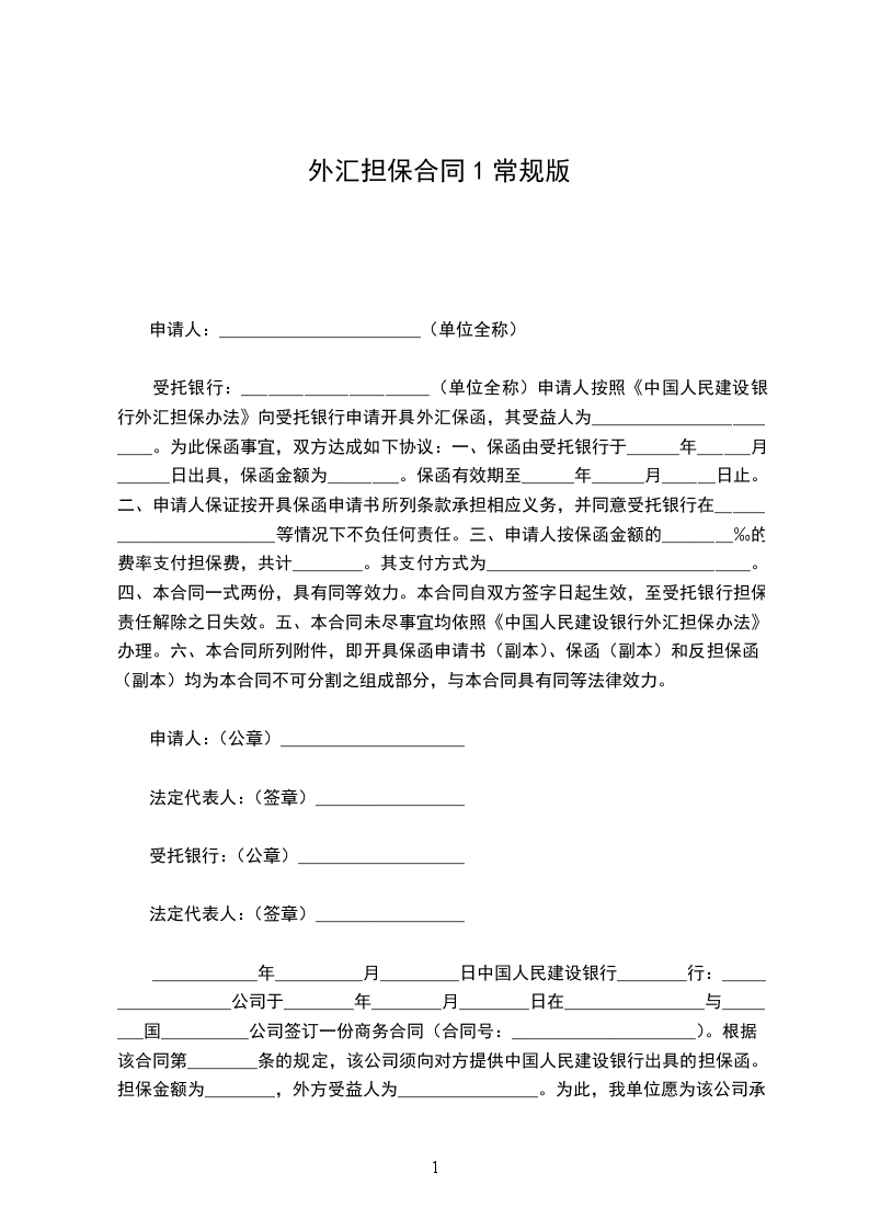 受托银行:_____________________(单位全称)申请人按照《中国人民建设银行外汇担保办法》向受托银行申请开具外汇保函,其受益人为________________________。为此保函事宜,双方达成如下协议:一、保函由受托银行于______年______月______日出具,保函金额为________。保函有效期至______年______月______日止。二、申请人保证按开具保函申请书所列条款承担相应义务,并同意受托银行在________________________等情况下不负任何责任。三、申请人按保函金额的________‰的费率支付担保费,共计________。其支付方式为______________________________。四、本合同一式两份,具有同等效力。本合同自双方签字日起生效,至受托银行担保责任解除之日失效。五、本合同未尽事宜均依照《中国人民建设银行外汇担保办法》办理。六、本合同所列附件,即开具保函申请书(副本)、保函(副本)和反担保函(副本)均为本合同不可分割之组成部分,与本合同具有同等法律效力。