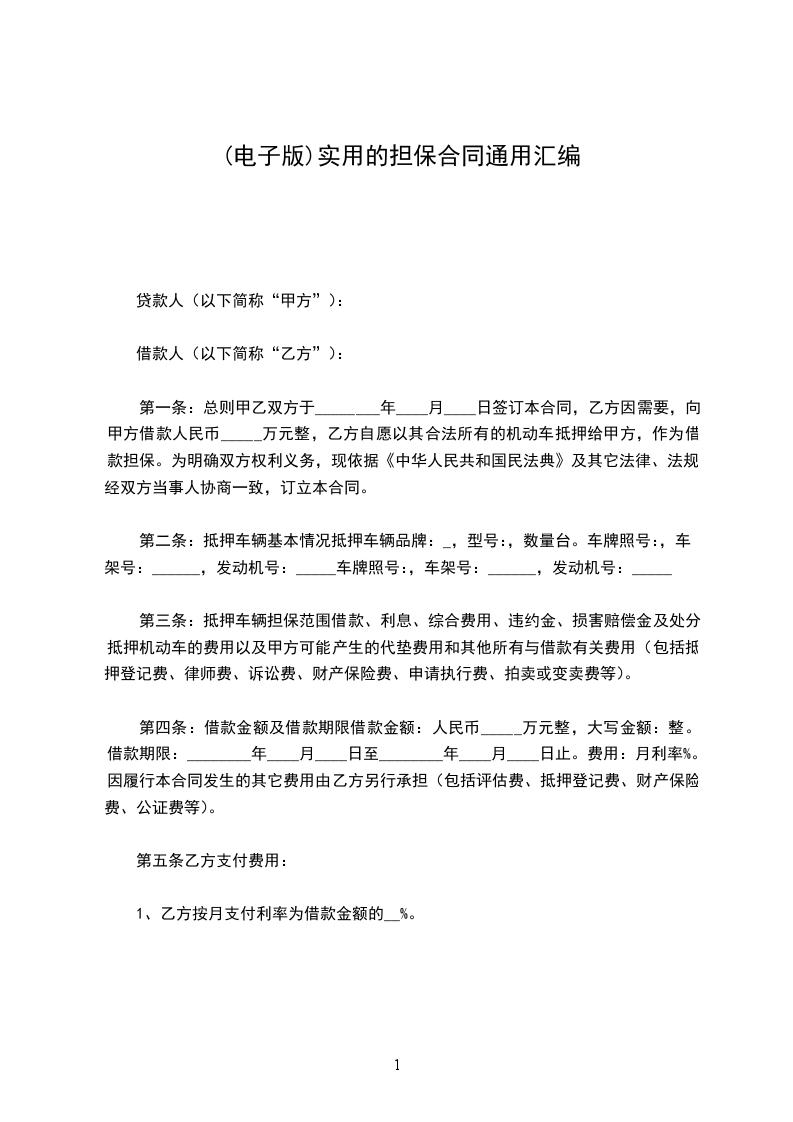 第一条:总则甲乙双方于________年____月____日签订本合同,乙方因需要,向甲方借款人民币_____万元整,乙方自愿以其合法所有的机动车抵押给甲方,作为借款担保。为明确双方权利义务,现依据《中华人民共和国民法典》及其它法律、法规,经双方当事人协商一致,订立本合同。