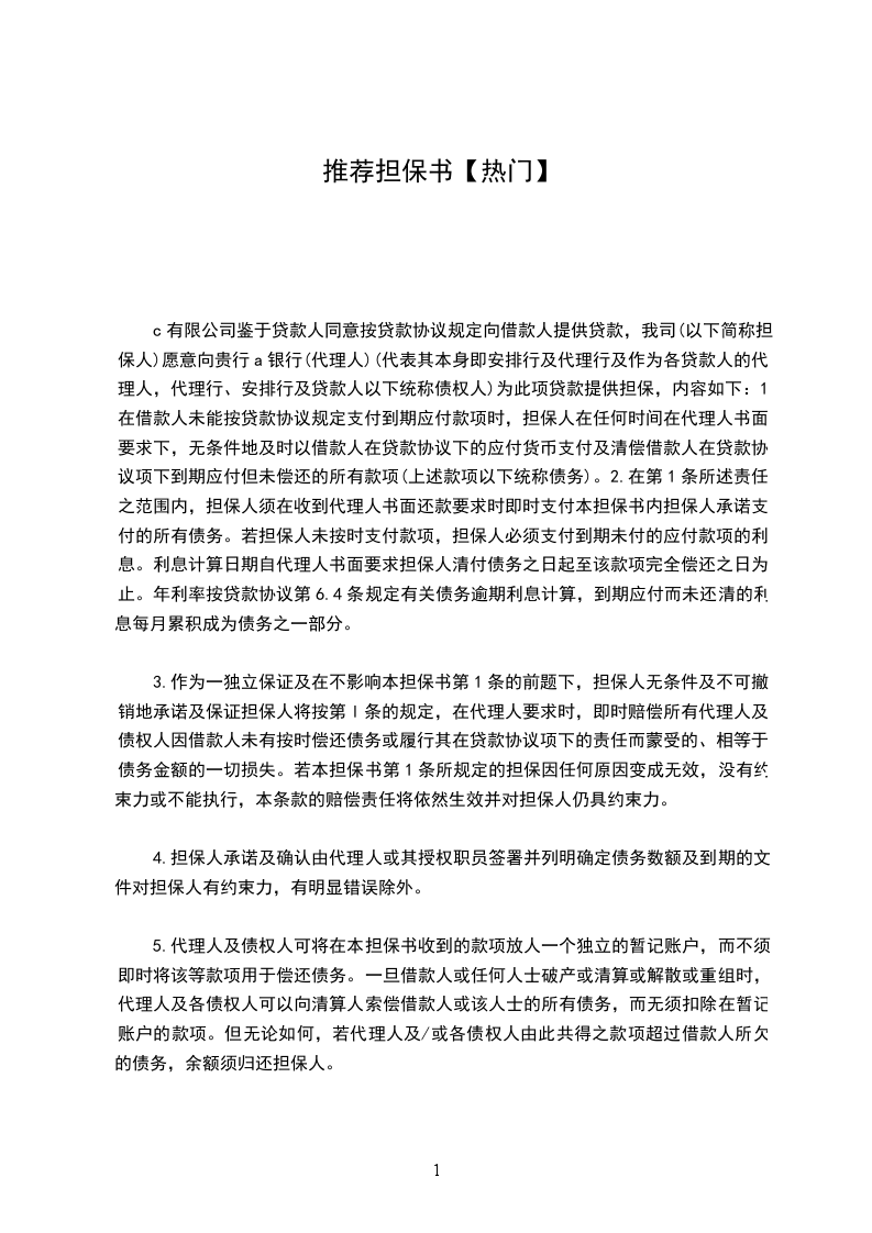 c有限公司鉴于贷款人同意按贷款协议规定向借款人提供贷款,我司(以下简称担保人)愿意向贵行a银行(代理人)(代表其本身即安排行及代理行及作为各贷款人的代理人,代理行、安排行及贷款人以下统称债权人)为此项贷款提供担保,内容如下:1.在借款人未能按贷款协议规定支付到期应付款项时,担保人在任何时间在代理人书面要求下,无条件地及时以借款人在贷款协议下的应付货币支付及清偿借款人在贷款协议项下到期应付但未偿还的所有款项(上述款项以下统称债务)。2.在第1条所述责任之范围内,担保人须在收到代理人书面还款要求时即时支付本担保书内担保人承诺支付的所有债务。若担保人未按时支付款项,担保人必须支付到期未付的应付款项的利息。利息计算日期自代理人书面要求担保人清付债务之日起至该款项完全偿还之日为止。年利率按贷款协议第6.4条规定有关债务逾期利息计算,到期应付而未还清的利息每月累积成为债务之一部分。