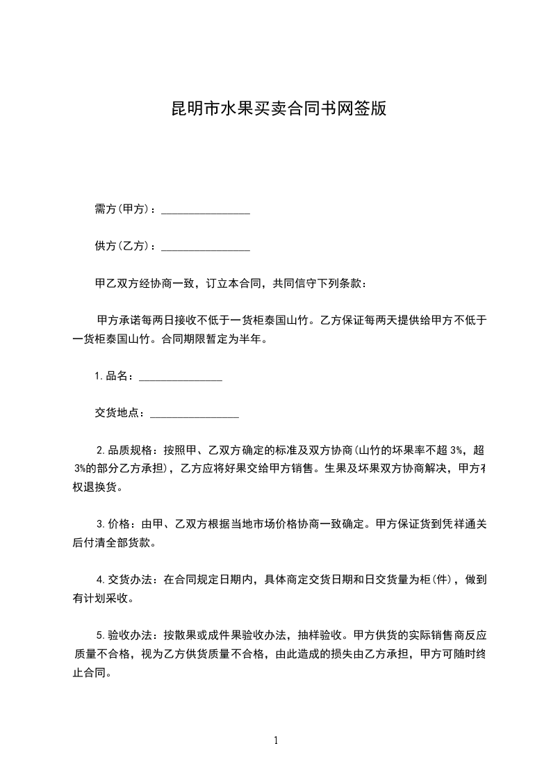 买卖办法:甲方买卖优质红富士苹果,先由乙方按质量标准分级初验,再由甲方复验,以甲方验级为准。