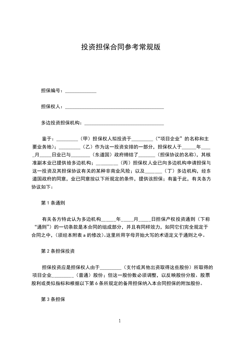 鉴于:_________(甲)担保权人拟投资于_________(“项目企业”的名称和主要业务地);_________(乙)作为这一投资安排的一部分,担保权人于______年_____月_____日业已与________(东道国)政府缔结了_______(担保协议的名称),其核准副本业已提供给多边机构;_________(丙)担保权人业已向多边机构申请担保与这一投资及其担保协议有关的某种非商业风险;以及_______(丁)多边机构,经东道国政府的同意,业已同意按以下所规定的条件,提供该担保;有鉴于此,有关各方协议如下: