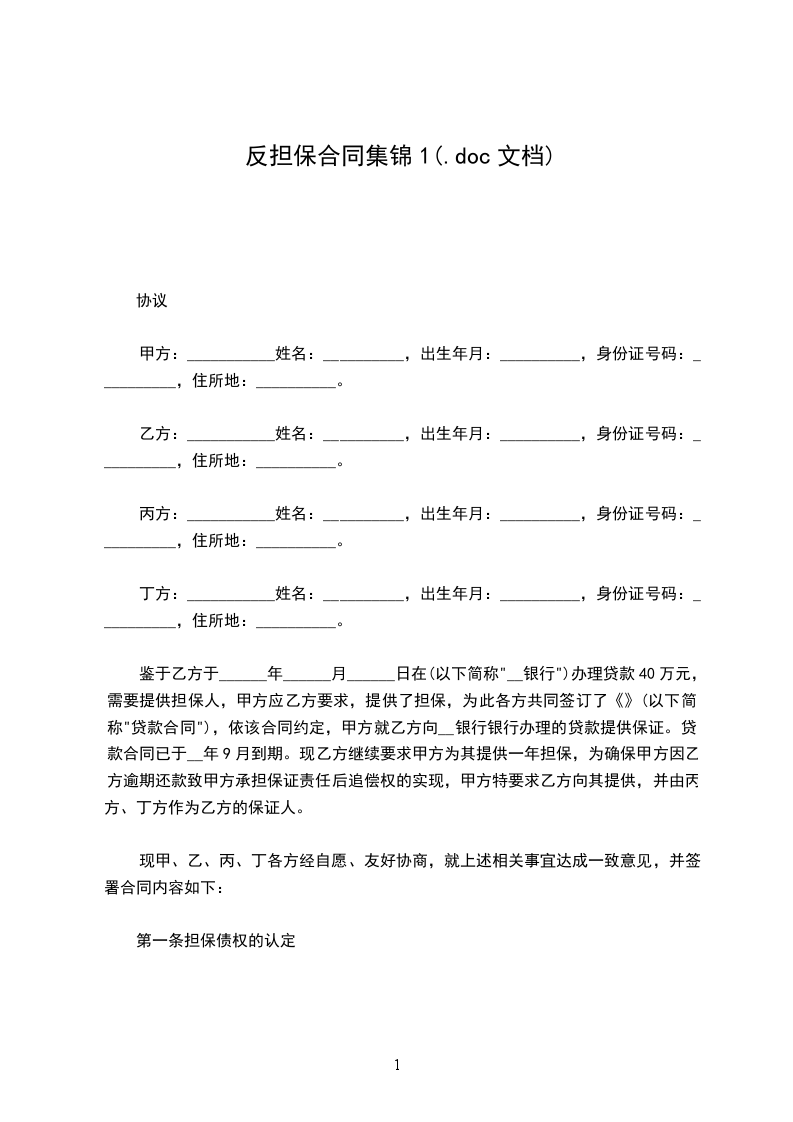 根据甲方与(以下简称放贷银行)____年___月___日签订的《保证合同》(合同编号)的约定,为保证乙方与放贷银行于____年___月___日签订的第___号《借款合同》的履行,丙方愿意为乙方向甲方提供,并承担责任,甲方经过审查同意接受丙方的,甲、乙、丙三方根据国家法律法规的规定,经协商一致订立本合同。