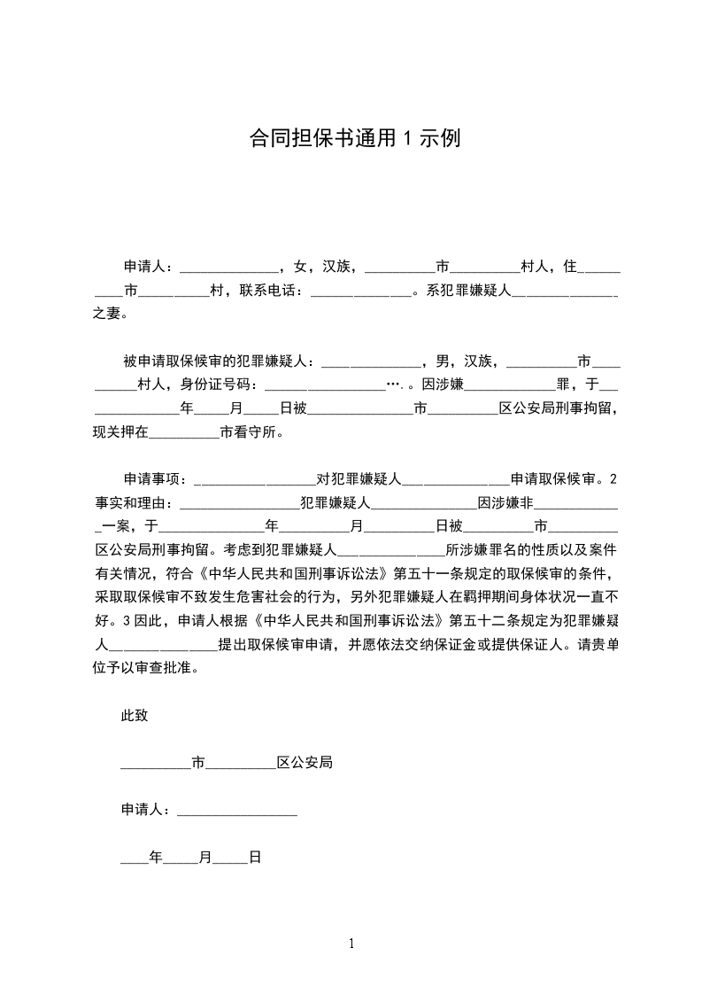 申请事项:_________________对犯罪嫌疑人_______________申请取保候审。2事实和理由:_________________犯罪嫌疑人_______________因涉嫌非_____________一案,于_______________年__________月__________日被__________市__________区公安局刑事拘留。考虑到犯罪嫌疑人_______________所涉嫌罪名的性质以及案件有关情况,符合《中华人民共和国刑事诉讼法》第五十一条规定的取保候审的条件,采取取保候审不致发生危害社会的行为,另外犯罪嫌疑人在羁押期间身体状况一直不好。3因此,申请人根据《中华人民共和国刑事诉讼法》第五十二条规定为犯罪嫌疑人_______________提出取保候审申请,并愿依法交纳保证金或提供保证人。请贵单位予以审查批准。