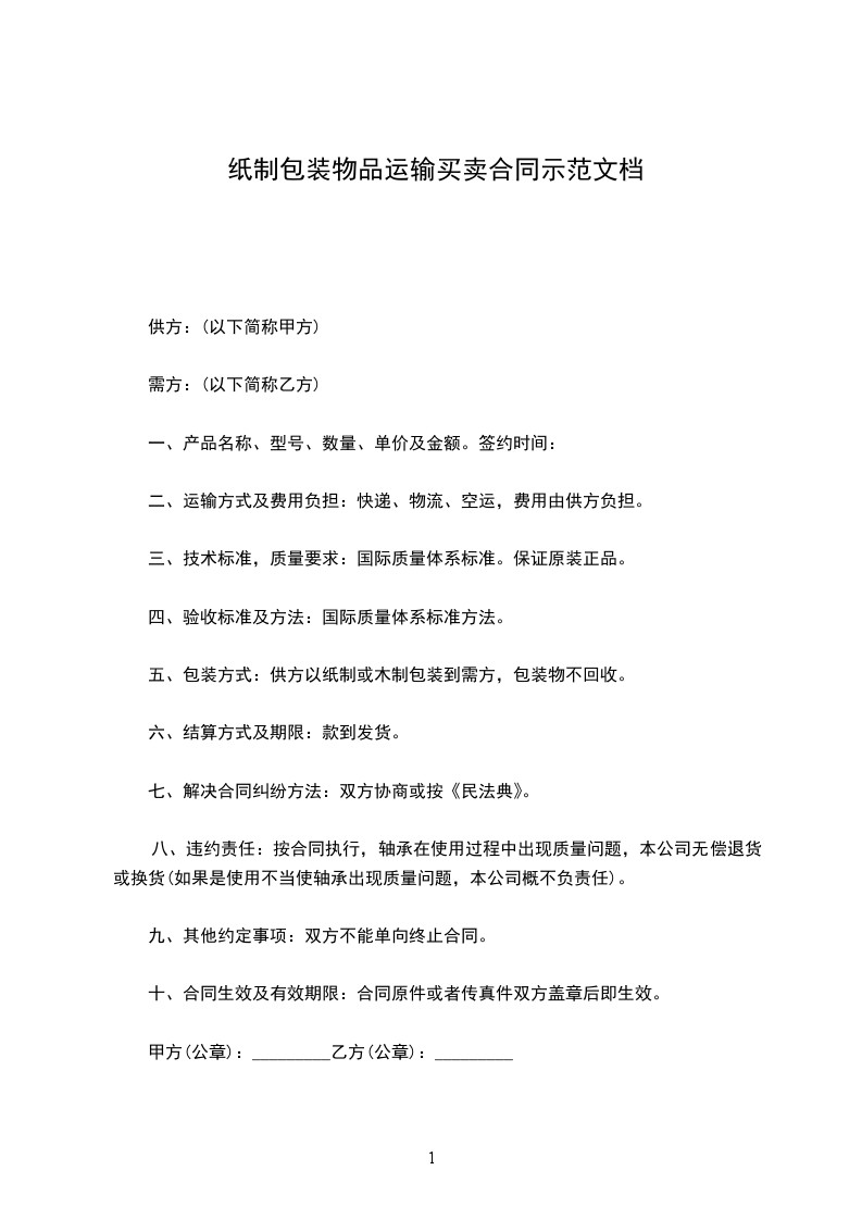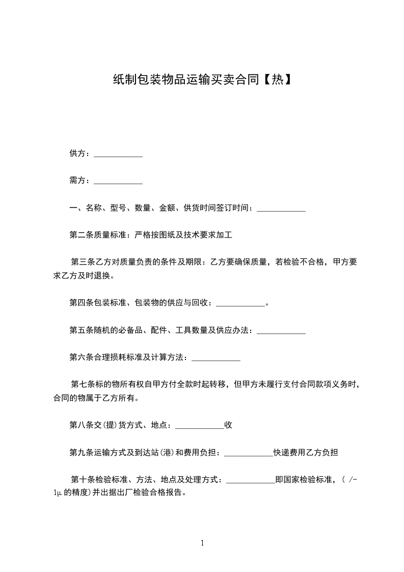 三、包装要求:用硬塑箱包装,籍由甲方自备。运输结束后所用箱由乙方在三天内返还甲方,若乙方将箱损坏,按价赔偿。